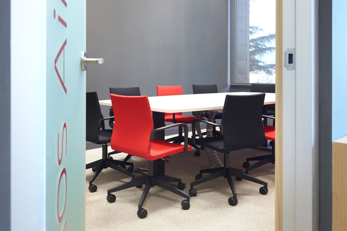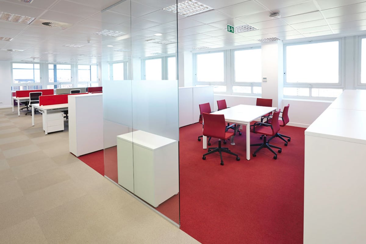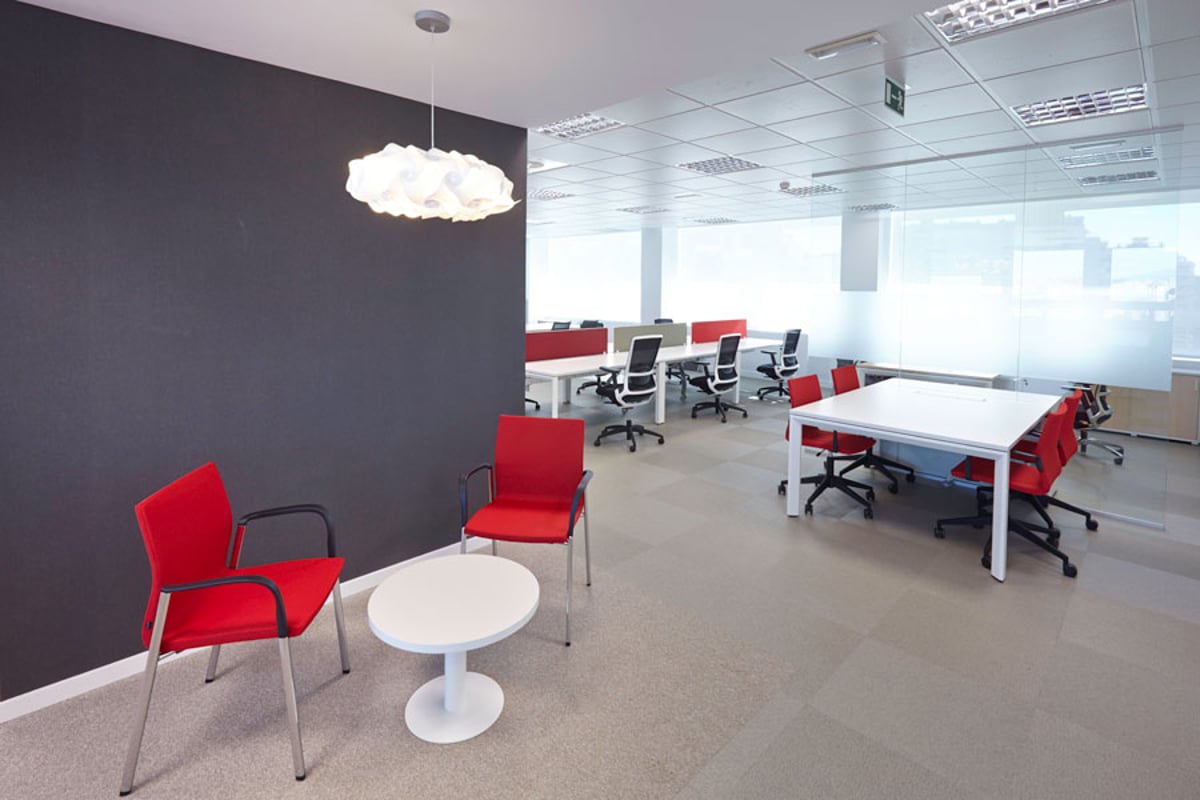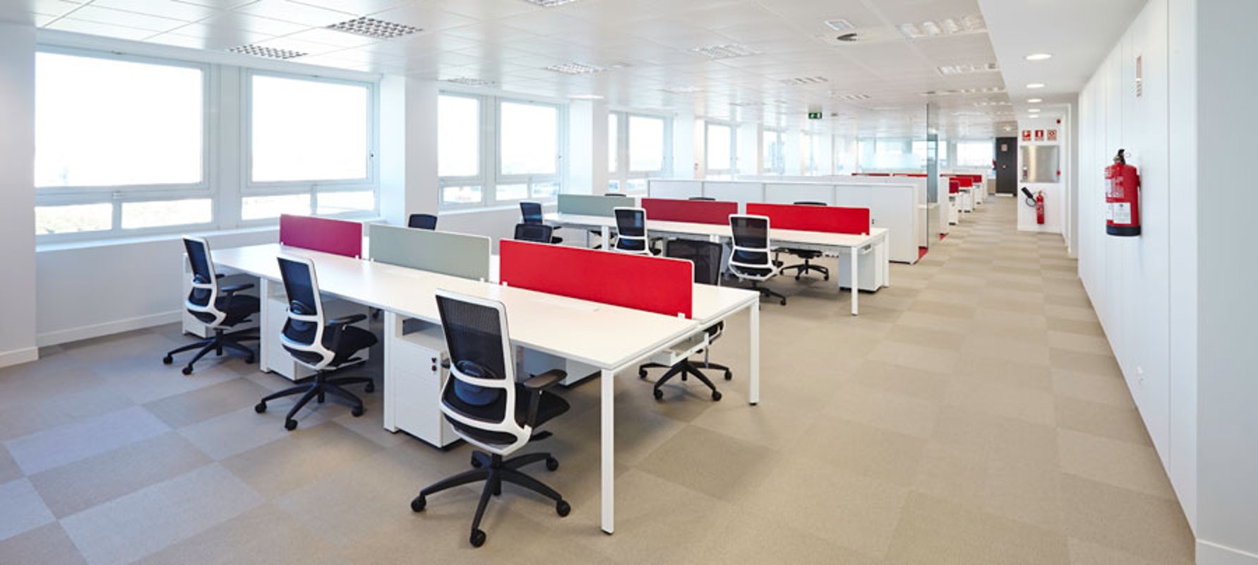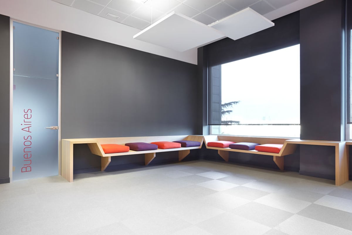 This has been a project where the details have been very well looked after, some specifically manufactured furniture to achieve the desired image. Thus, the supplements become particularly important. The tabletop screens, for example, are not only dividers but are also decorative, upholstered in the corporate colours (red, granite and beige) which standout in the room.