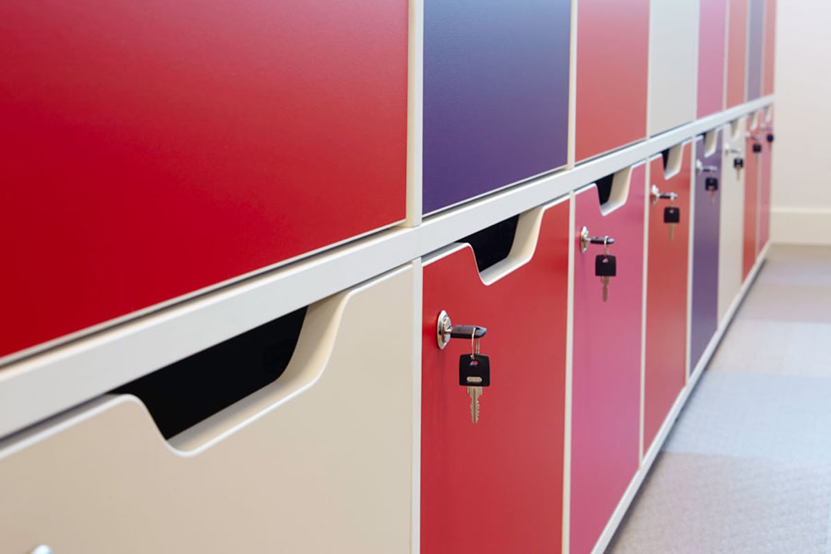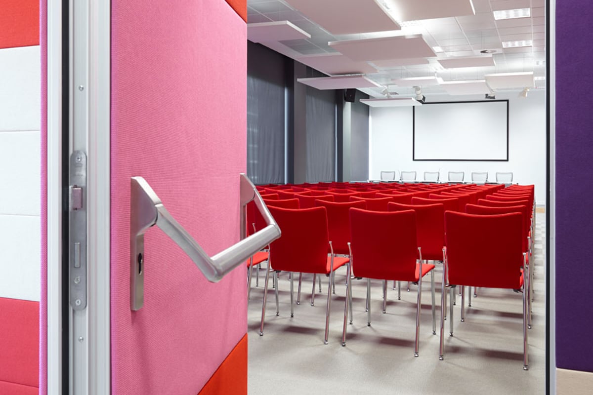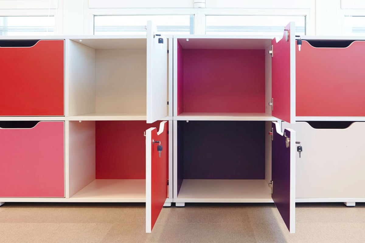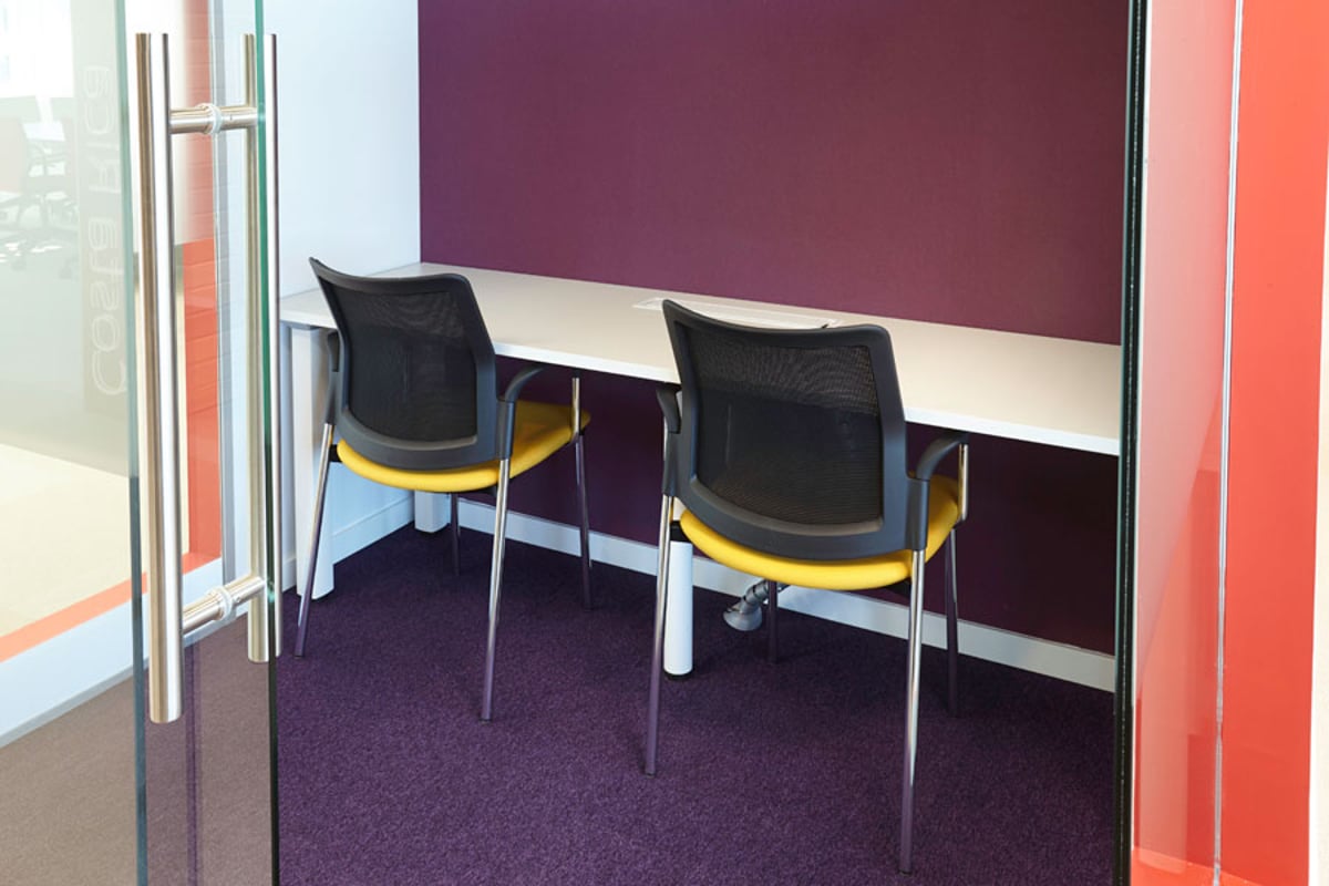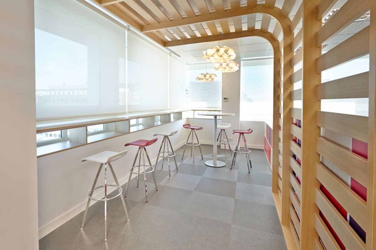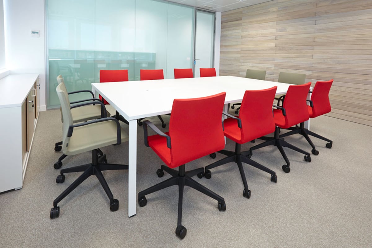 This has been a project where the details have been very well looked after, some specifically manufactured furniture to achieve the desired image. Thus, the supplements become particularly important. The tabletop screens, for example, are not only dividers but are also decorative, upholstered in the corporate colours (red, granite and beige) which standout in the room.