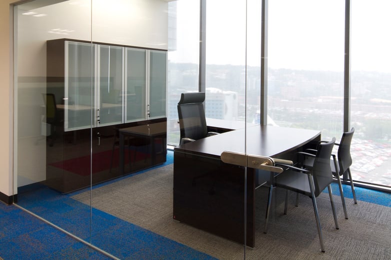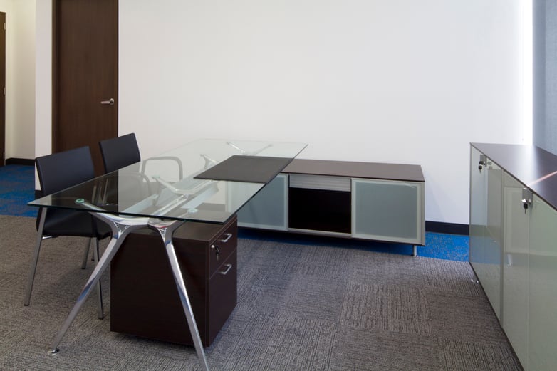 The Arco program of desks, with its straight lines and accentuated shapes provide timeless aesthetics characterised by its purity. A very suitable choice for management offices. In this case we have complemented them with the Kados chair, upholstered in black, with a headrest and fixed cast aluminium arms. The Uma visitor chair and two joined modules of modular cabinets are also present.