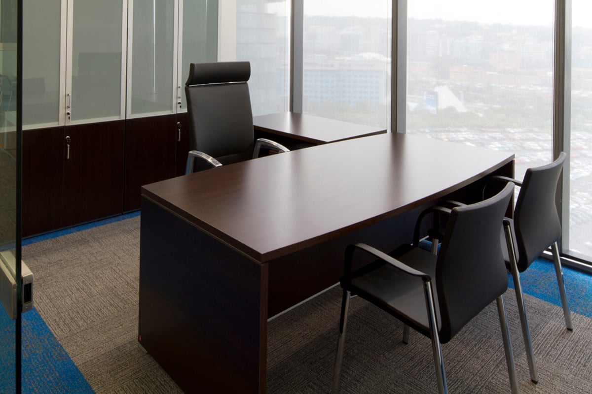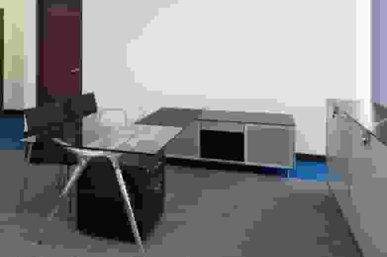 The Arco program of desks, with its straight lines and accentuated shapes provide timeless aesthetics characterised by its purity. A very suitable choice for management offices. In this case we have complemented them with the Kados chair, upholstered in black, with a headrest and fixed cast aluminium arms. The Uma visitor chair and two joined modules of modular cabinets are also present.