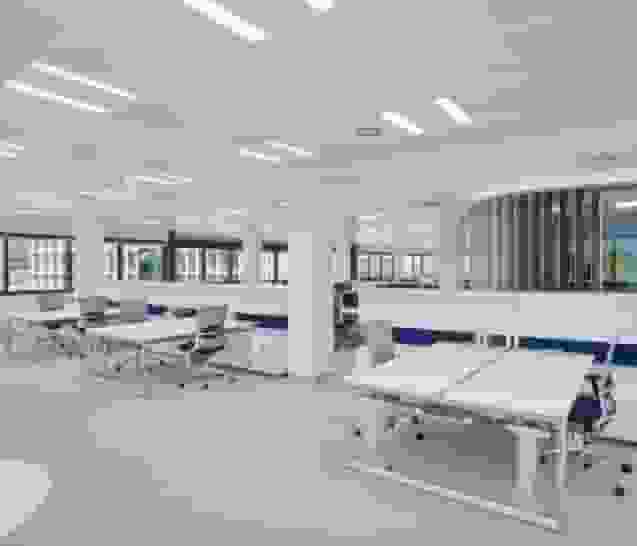 The workshops are distributed under the open office concept around some boxes that make an enclosed space, of different dimensions, for meetings or for situations in which greater concentration or privacy is required.