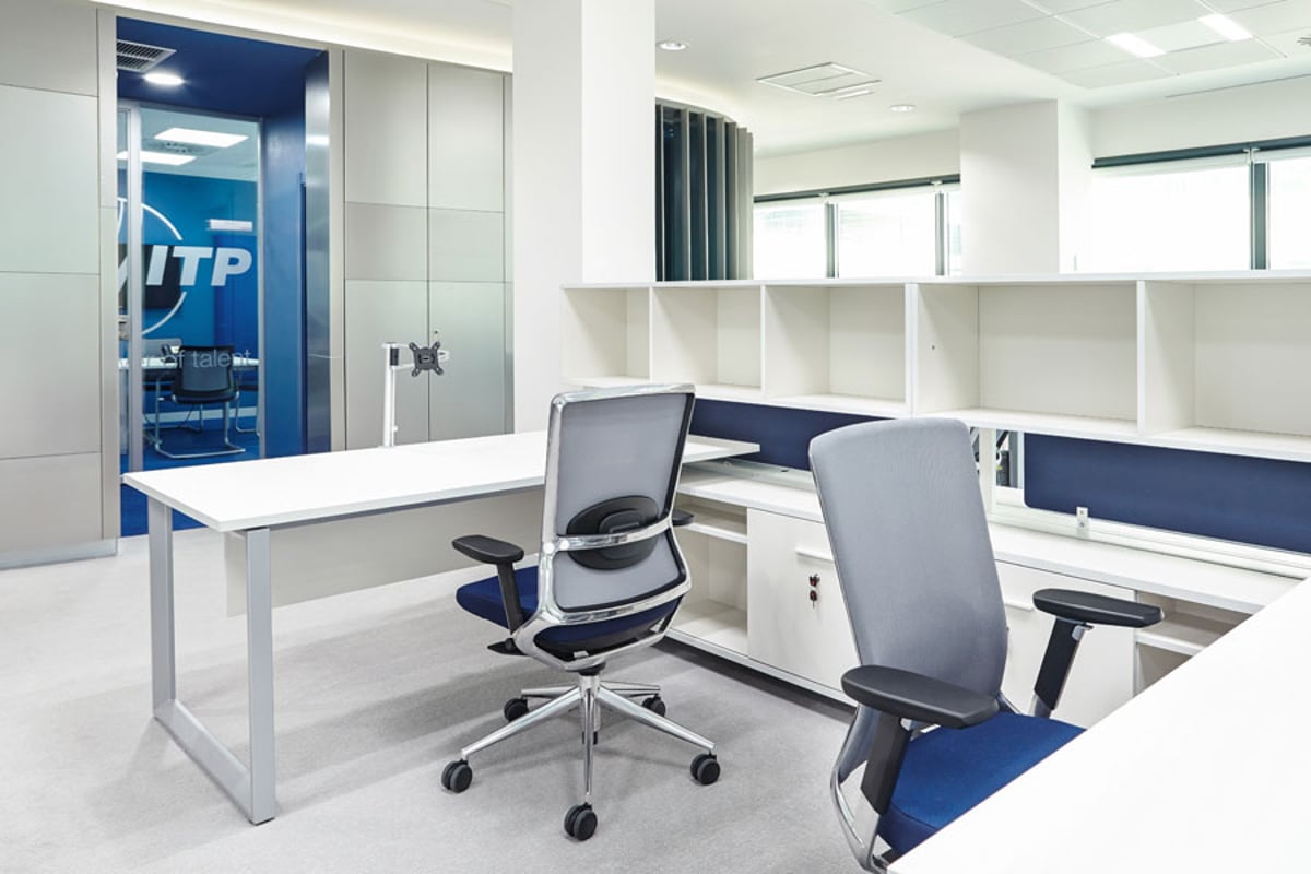 The removable pedestal, with inner drawers and shelves, was one of the most valued resources for ITP Aero, since these allow one to keep the work surfaces clean and organised, facilitating the order in the office. The TNK 500 chair was used for all operating positions. The sum of functional, techniques and technological details make it a very comfortable, timeless and elegant chair. Furthermore, to define each workspace, soundproofed screens were placed, upholstered in corporate blue, the same as the seats of the TNK 500 chairs which gave the environment a unique effect.