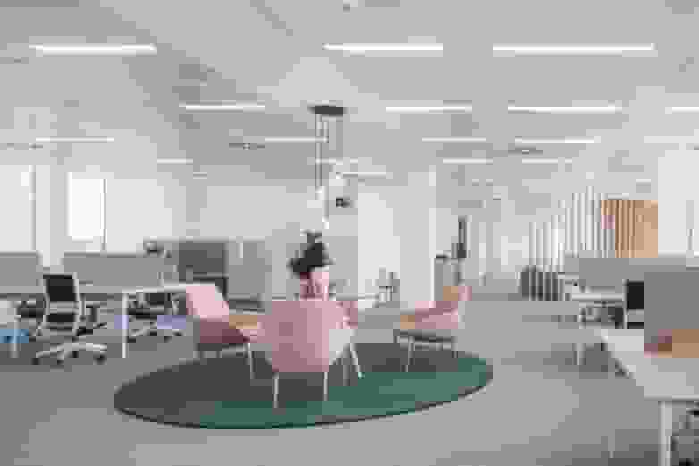 Open plan and very bright, the large open space that presides over the office personifies the new work philosophy, where the traditional office gives way to vastly different working environments. From operating stations that combine the visual lightness of the Longo tables with the great versatility of the Stay chairs, to Longo POD sound absorbing modules for private meetings, or small living rooms equipped with Whass chairs or Noom 10 hammocks, together with an Arkitek side table, for informal meetings.