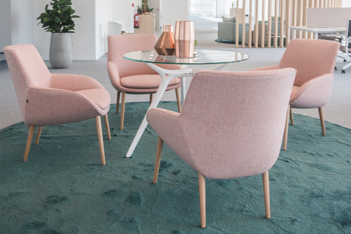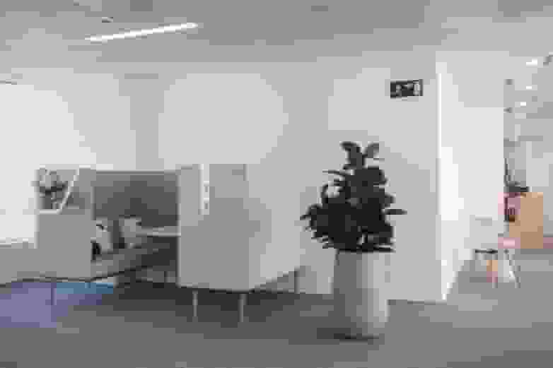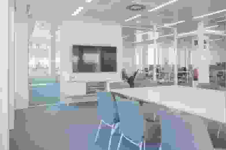 Separated from the large open-plan area by a floor-to-ceiling glass enclosure, the meeting room boasts a combination that is both elegant and sober, with a white Arkitek table, comfortable grey upholstered Noom 30 chairs and a Longo side table.