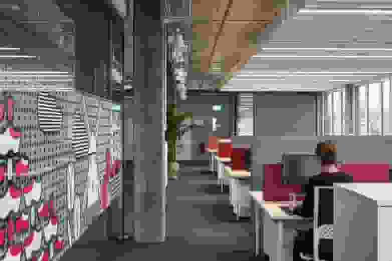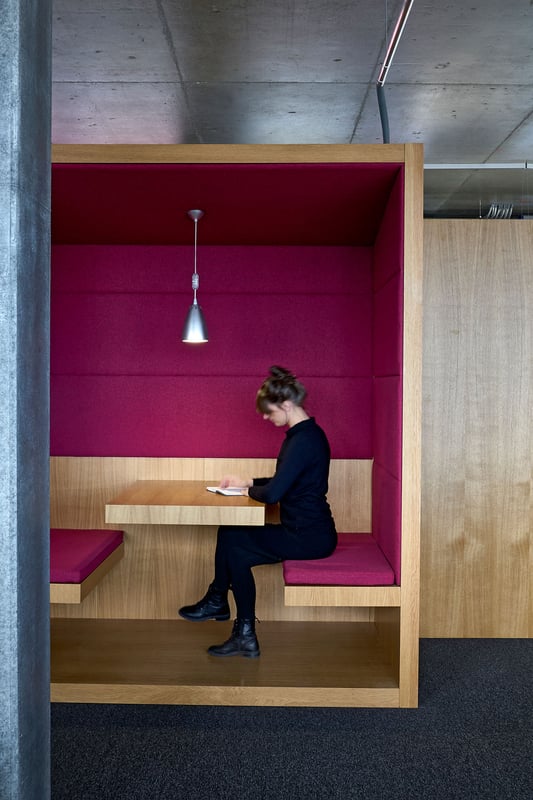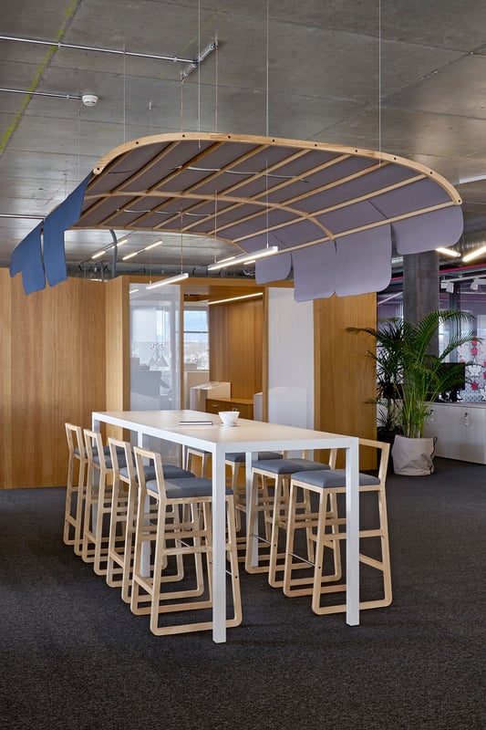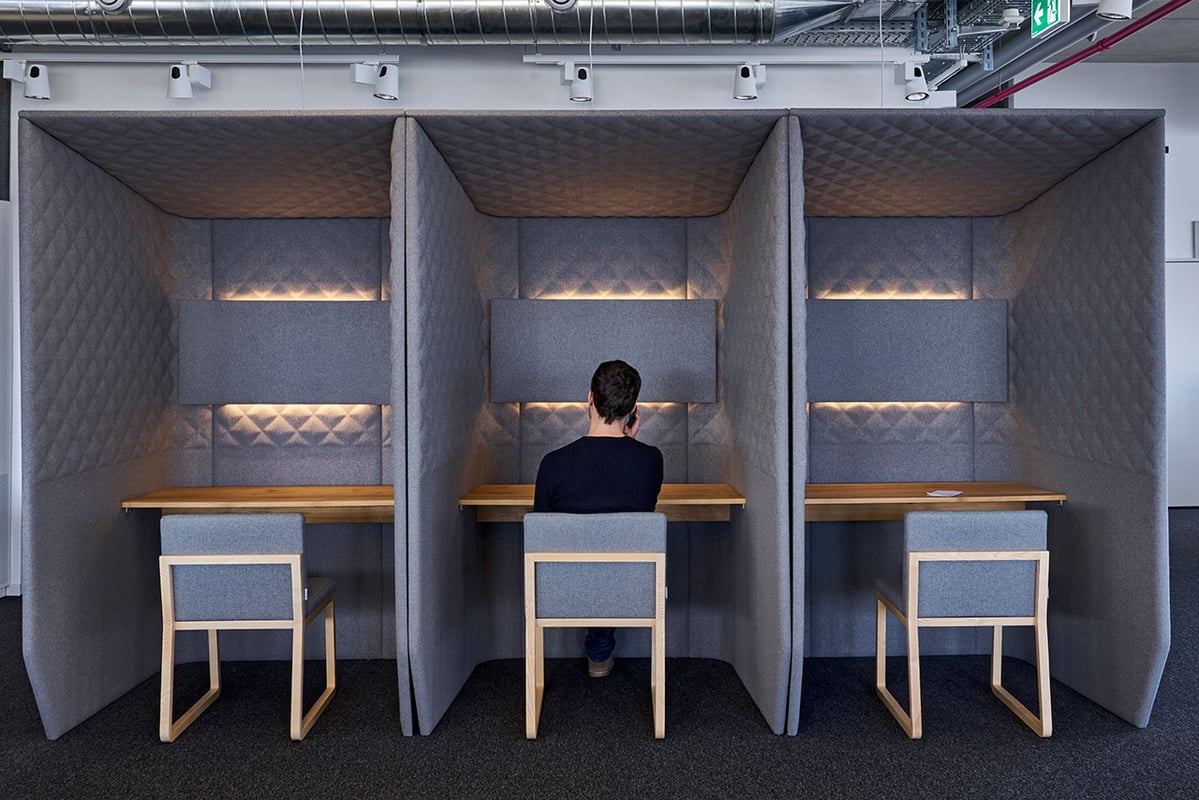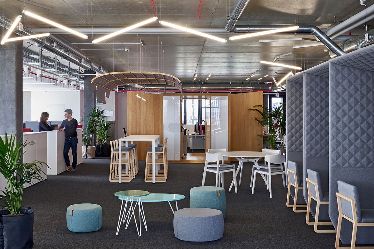 The architecture studio Bloomint in Barcelona has proposed an office with a variety of new spaces. An open space, private rooms, but also a large cafeteria, gym, large meeting areas, resting areas, telephone booths and even a games room. The concept came from offices designed for people, finding a balance between corporate design and social spaces. So they divided two large spaces into corporate and non-corporate areas. The primary aim: the well-being of their employees and attracting talent, creating a work space where people want to work.