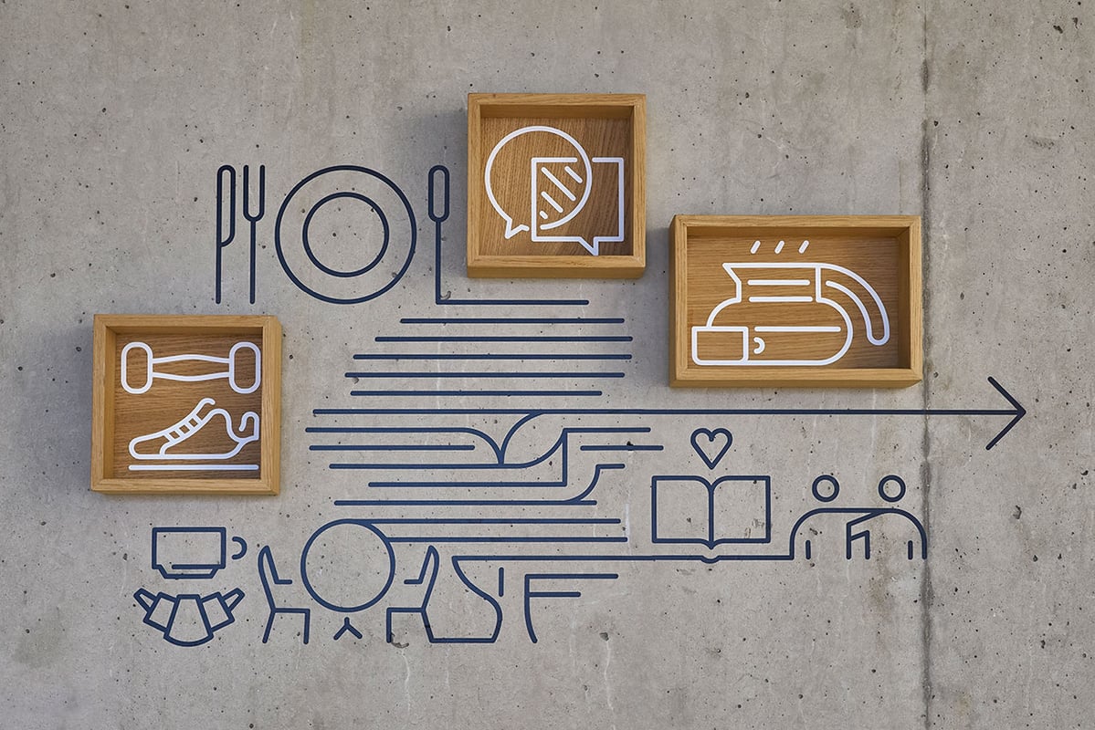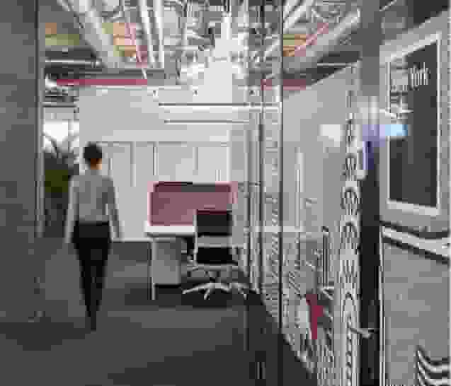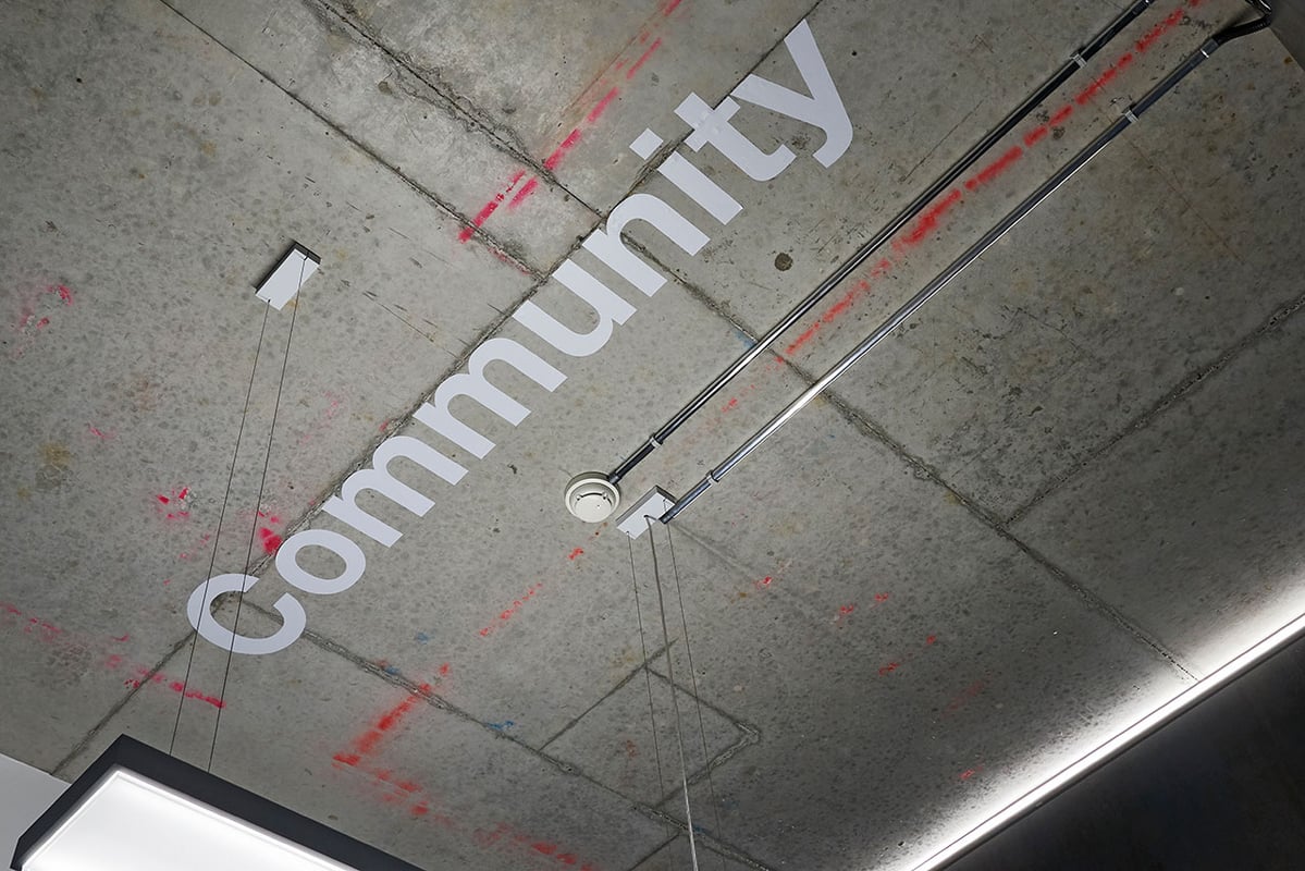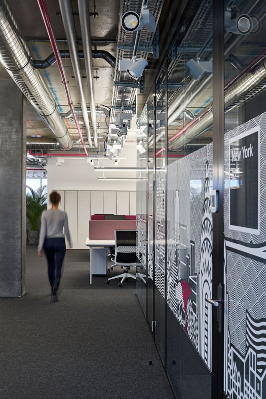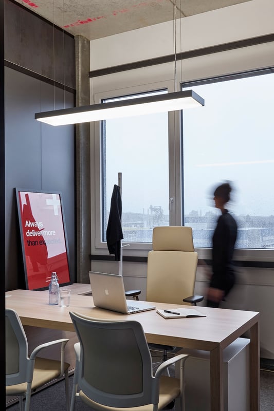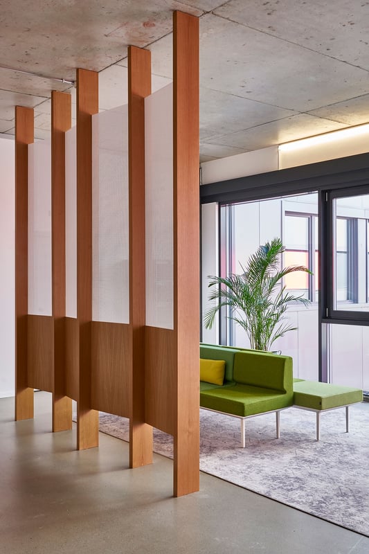 The architecture studio Bloomint in Barcelona has proposed an office with a variety of new spaces. An open space, private rooms, but also a large cafeteria, gym, large meeting areas, resting areas, telephone booths and even a games room. The concept came from offices designed for people, finding a balance between corporate design and social spaces. So they divided two large spaces into corporate and non-corporate areas. The primary aim: the well-being of their employees and attracting talent, creating a work space where people want to work.