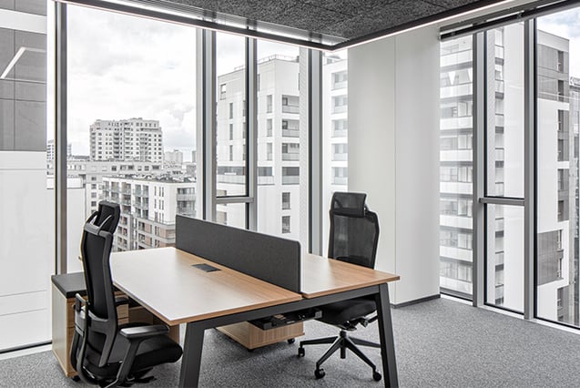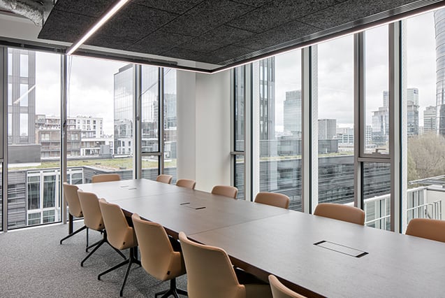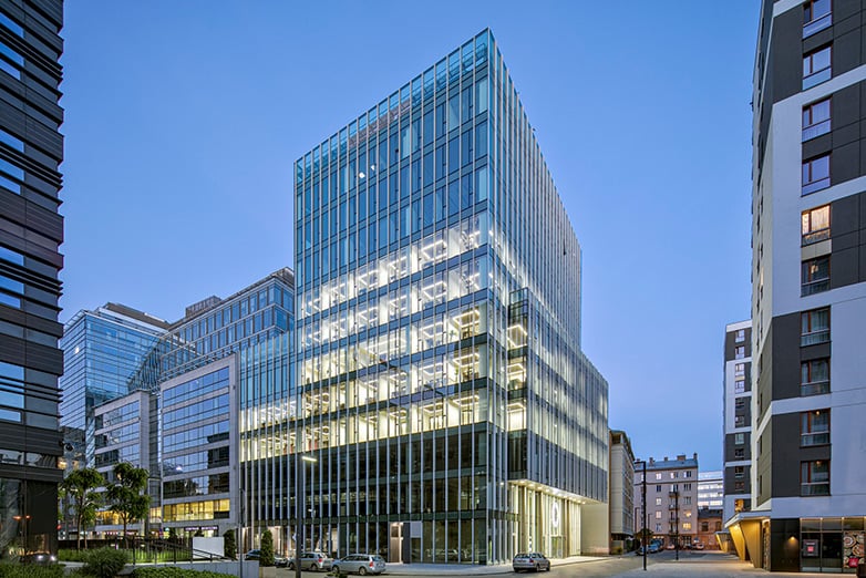 Located in a fast-growing commercial area of the Polish capital, the offices occupy five floors of a building built in 2019 and shared with other companies. A space that was delivered in a "raw" state, with only the shell of the facade and the vertical access core, which the real estate team of the pharmaceutical company has aesthetically and technically refurbished.