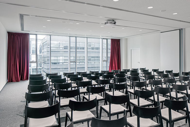 As for the presentation or event room, the Wing chair has been chosen in black and with an upholstered seat for greater comfort. Its ability to be stacked, which allows up to sixteen chairs to be placed on a trolley, makes it easy to change the layout of a room, which has been designed to be very versatile to accommodate different uses.