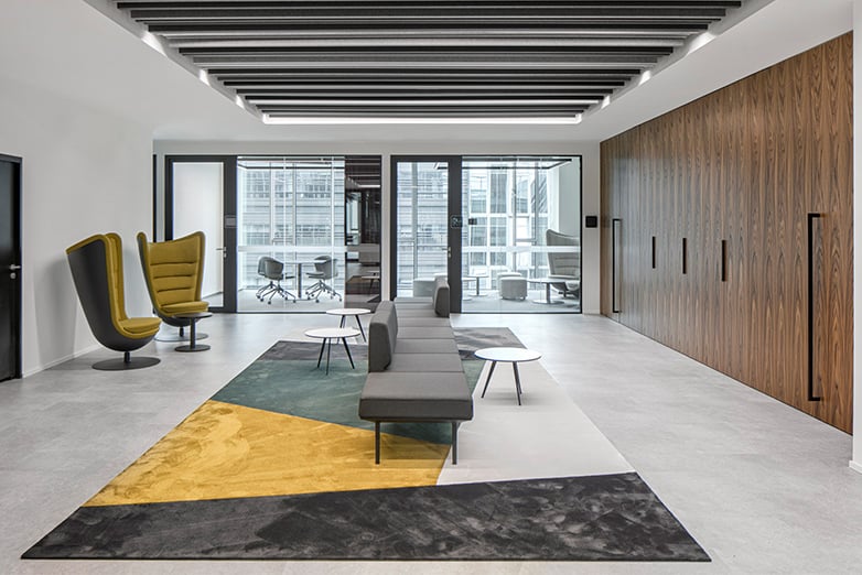 The rest of the "unofficial" meeting spaces are carefully distributed throughout the space to encourage communication and the exchange of ideas between workers. Through models such as the versatile Bend soft seating, the Longo modular system, the iconic Badminton lounge seating, the Noom 20 armchair, the Tabula table or the Whass chairs and stools, environments halfway between the office and contract or restaurant spaces are recreated, tinted with a more playful and cheerful colour range, inviting workers to sit back and relax.