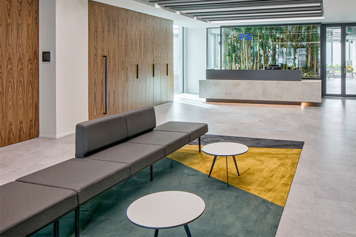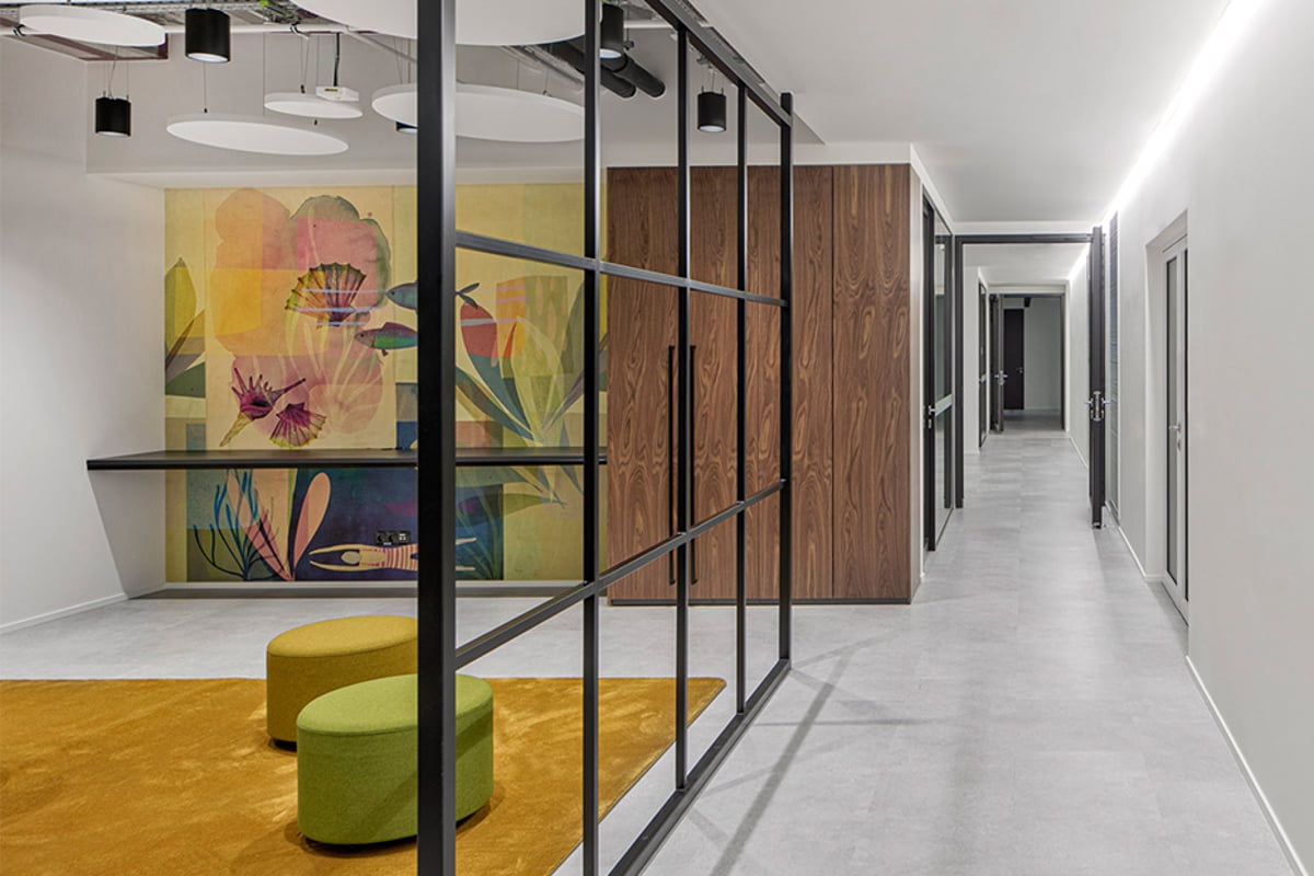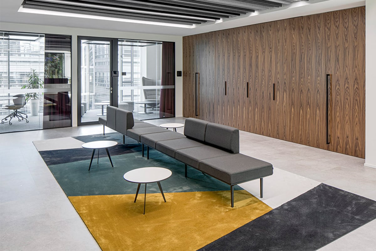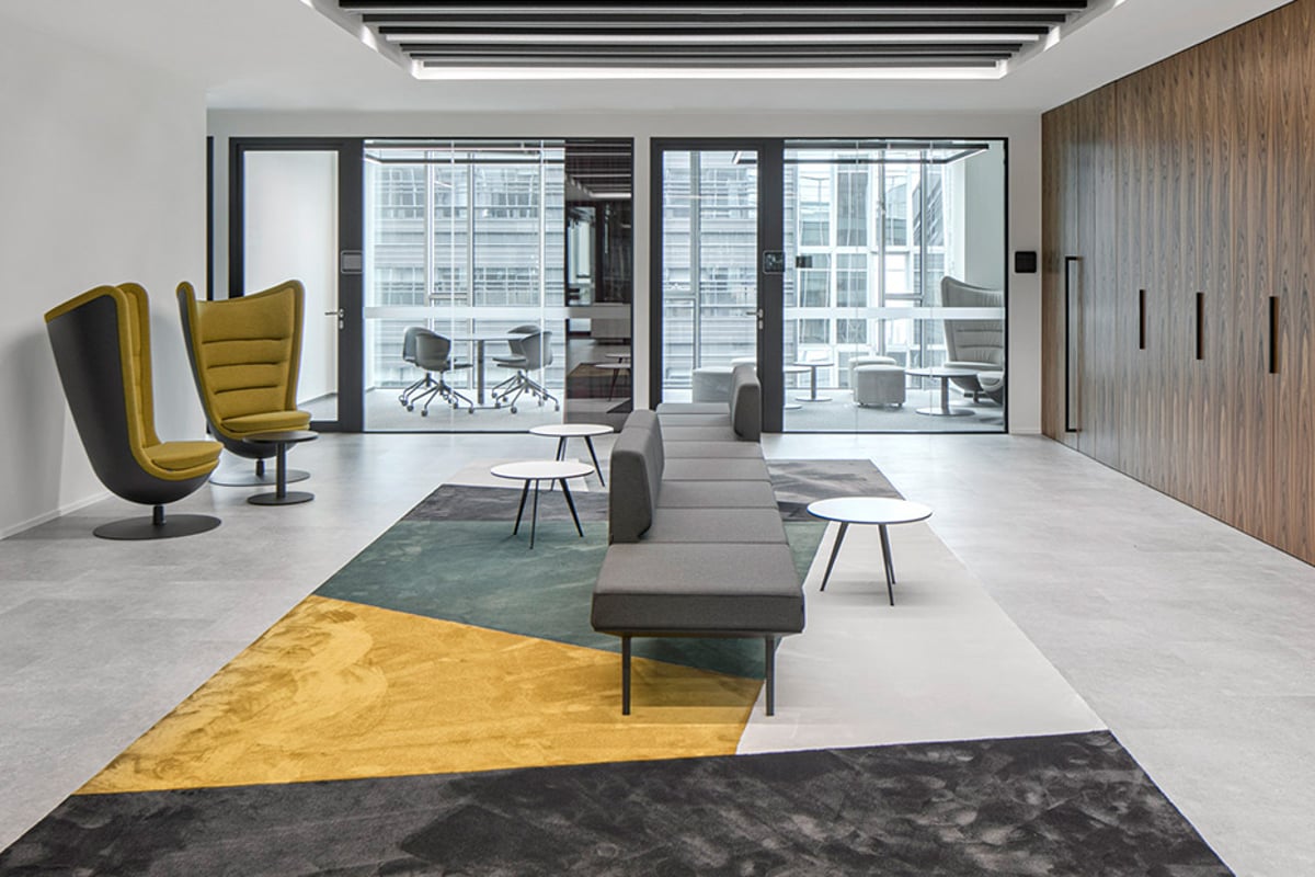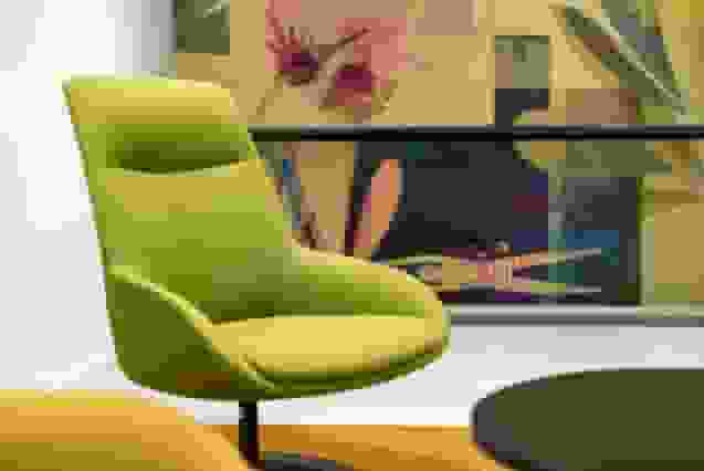 The rest of the "unofficial" meeting spaces are carefully distributed throughout the space to encourage communication and the exchange of ideas between workers. Through models such as the versatile Bend soft seating, the Longo modular system, the iconic Badminton lounge seating, the Noom 20 armchair, the Tabula table or the Whass chairs and stools, environments halfway between the office and contract or restaurant spaces are recreated, tinted with a more playful and cheerful colour range, inviting workers to sit back and relax.
