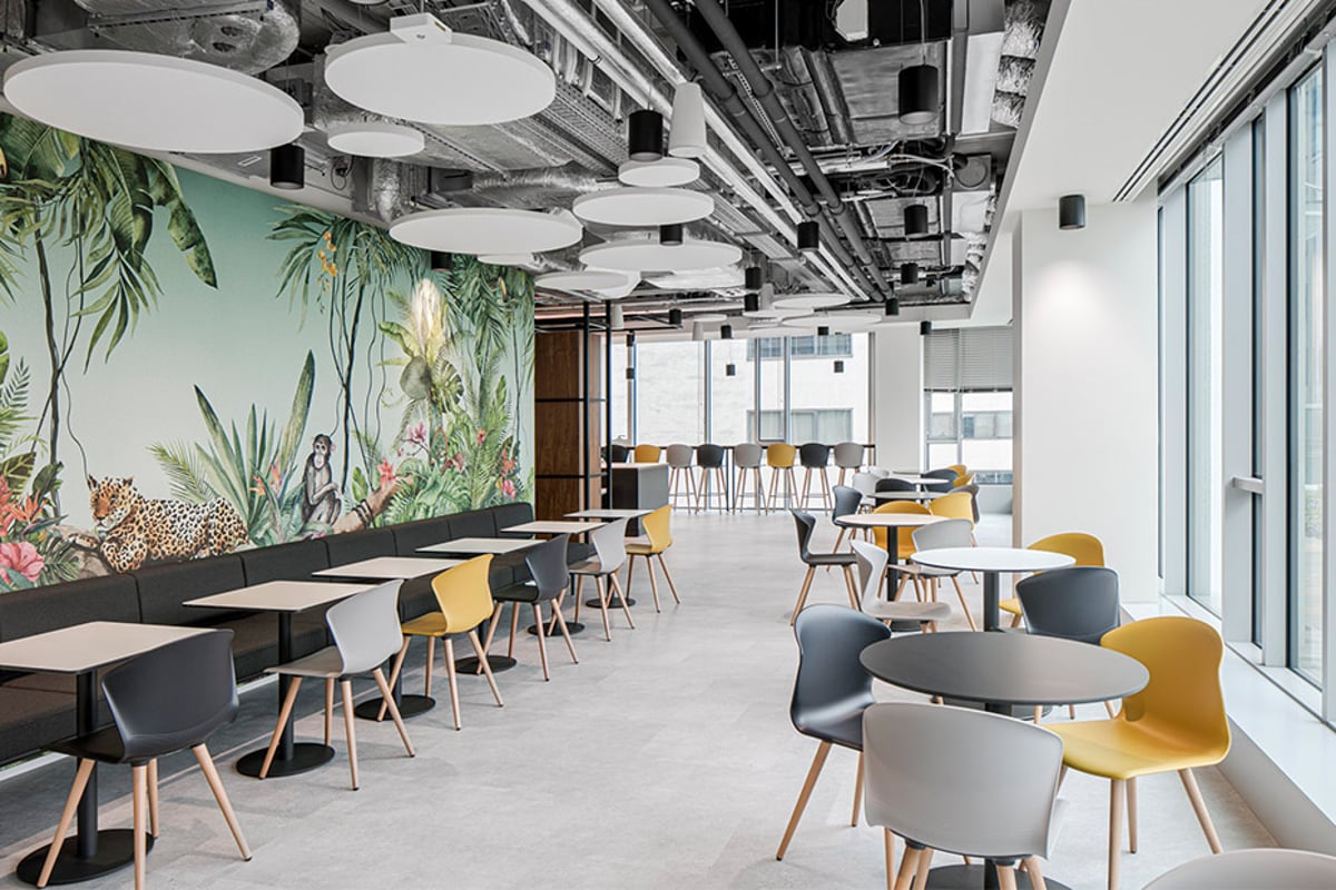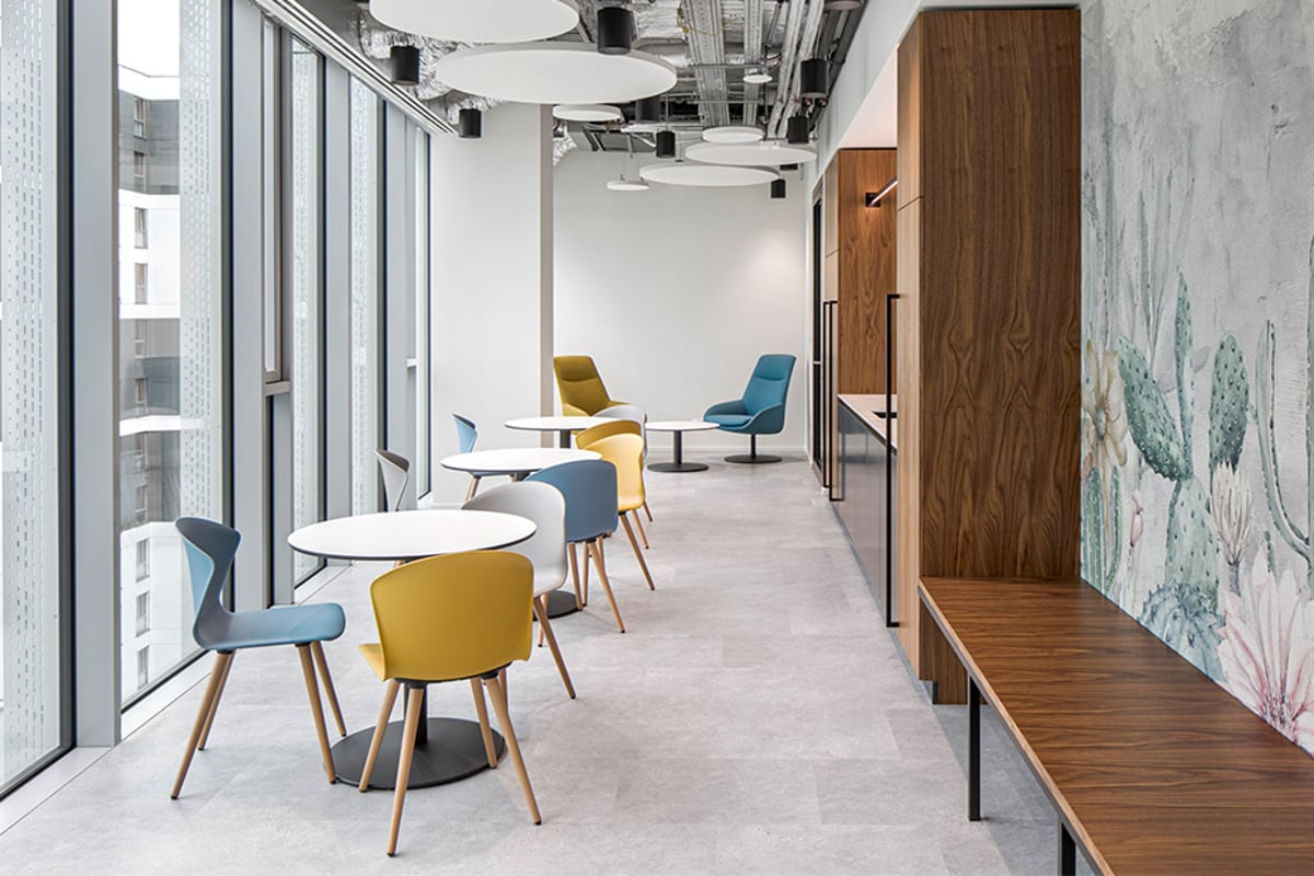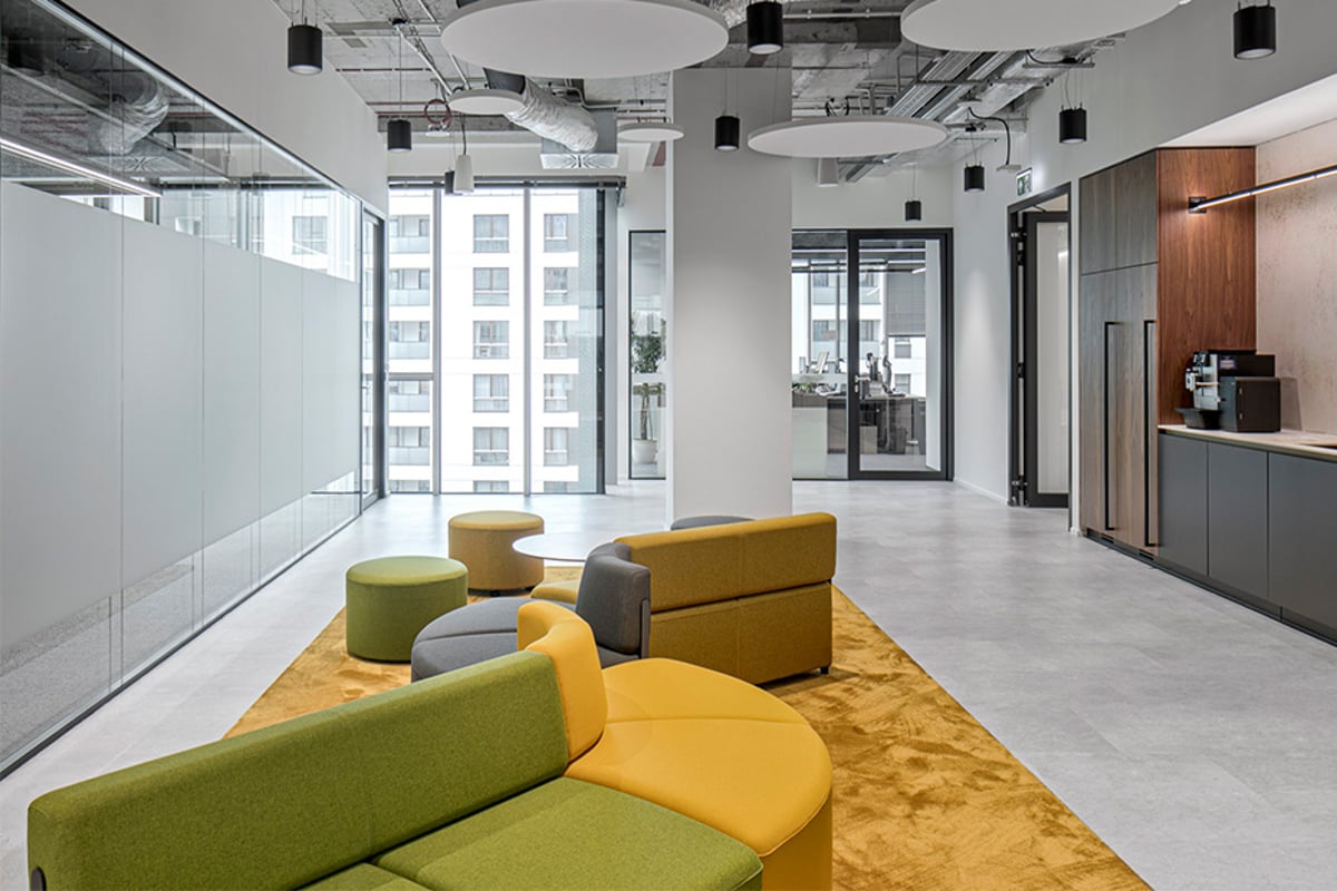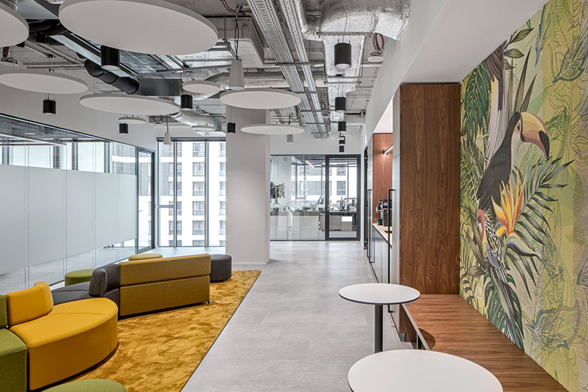 Located in a fast-growing commercial area of the Polish capital, the offices occupy five floors of a building built in 2019 and shared with other companies. A space that was delivered in a "raw" state, with only the shell of the facade and the vertical access core, which the real estate team of the pharmaceutical company has aesthetically and technically refurbished.