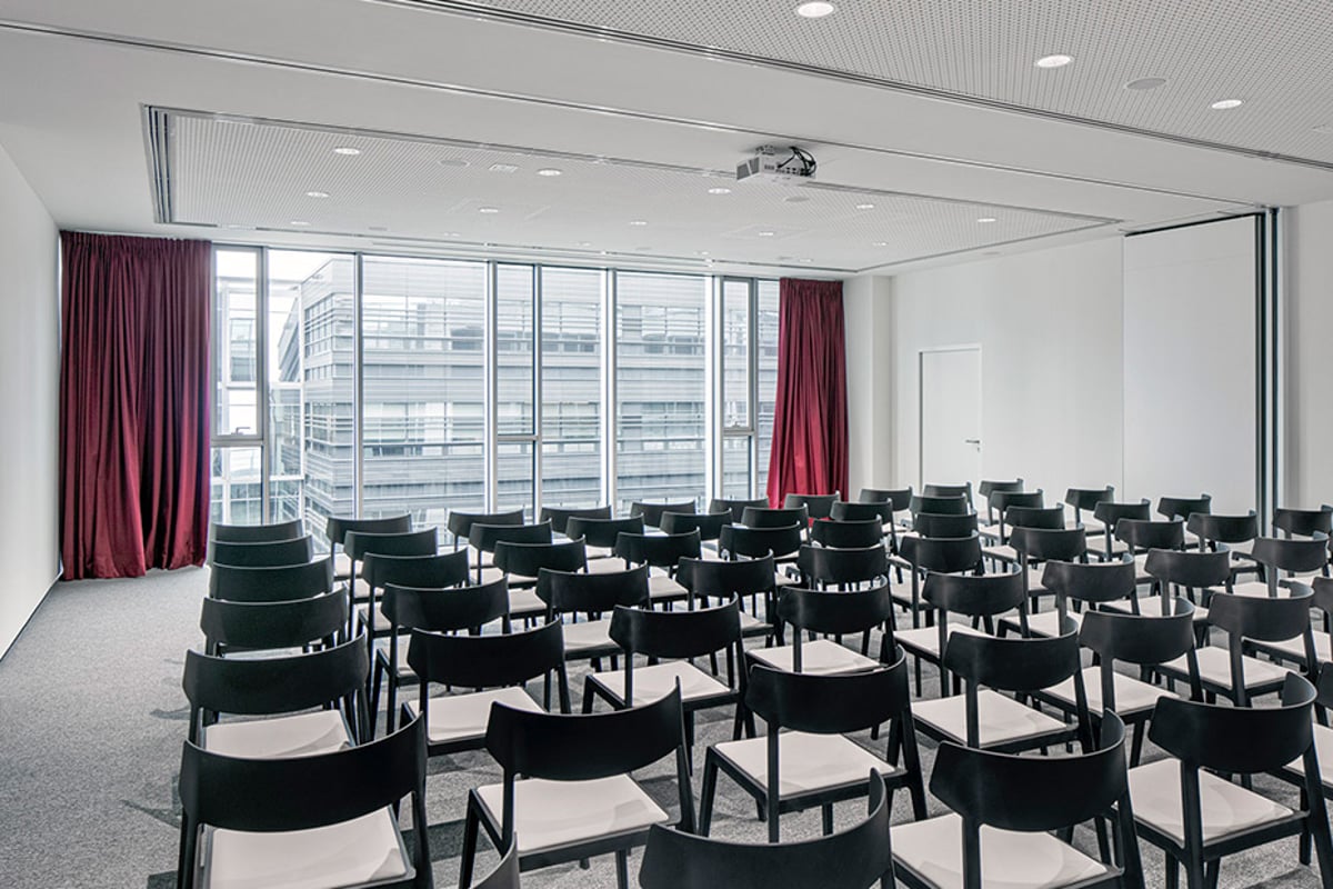 As for the presentation or event room, the Wing chair has been chosen in black and with an upholstered seat for greater comfort. Its ability to be stacked, which allows up to sixteen chairs to be placed on a trolley, makes it easy to change the layout of a room, which has been designed to be very versatile to accommodate different uses.