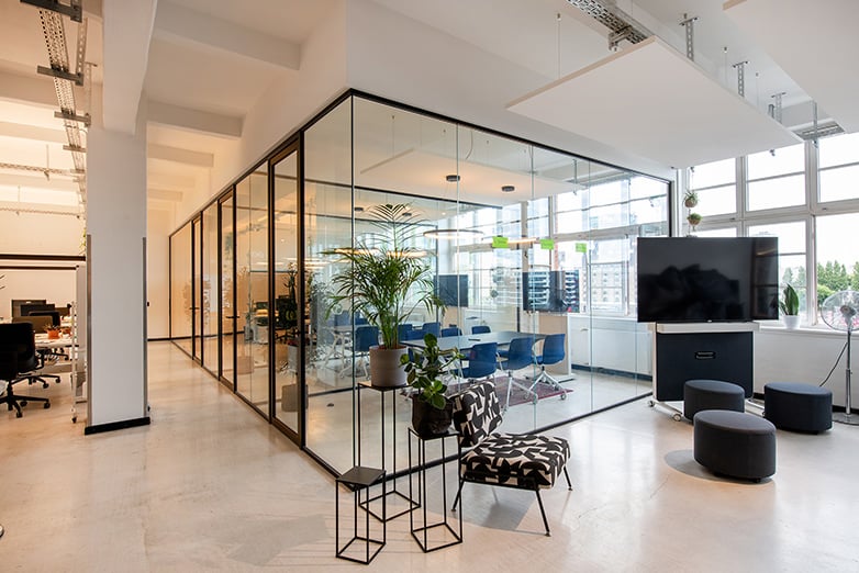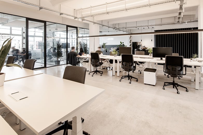 Located in the Kreutzberg district, the new offices respond to the work philosophy of a very agile, dynamic and flexible company in terms of hierarchies and timetables. An open-plan space with an open kitchen and communal area, fixed and flexible workstations, and three separate meeting rooms with glass partitions.