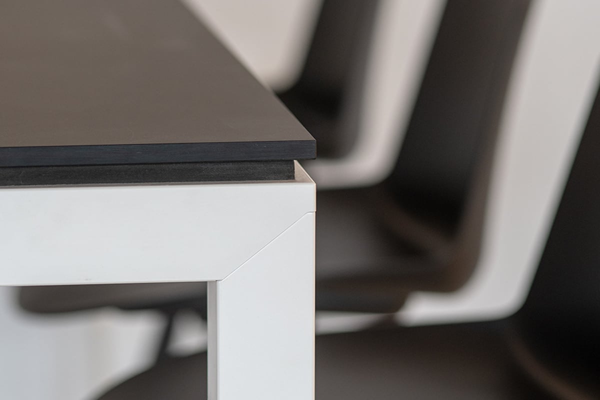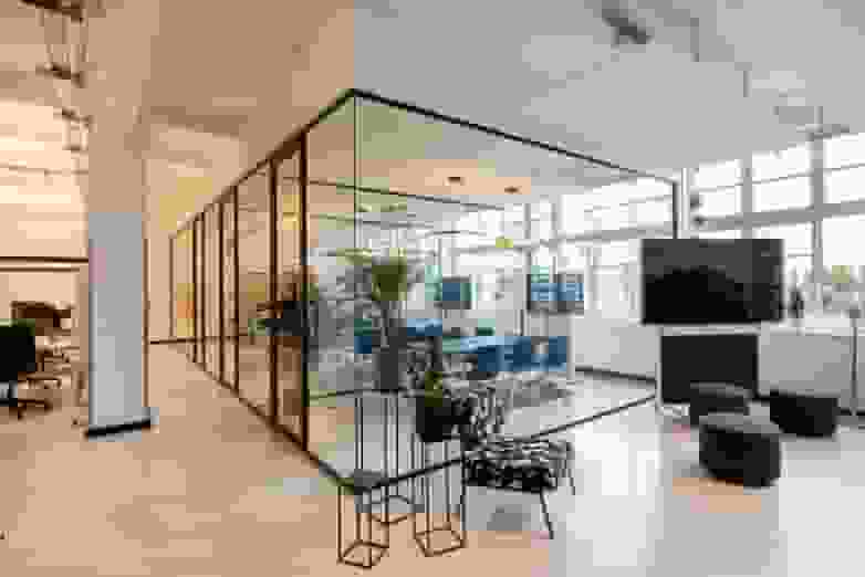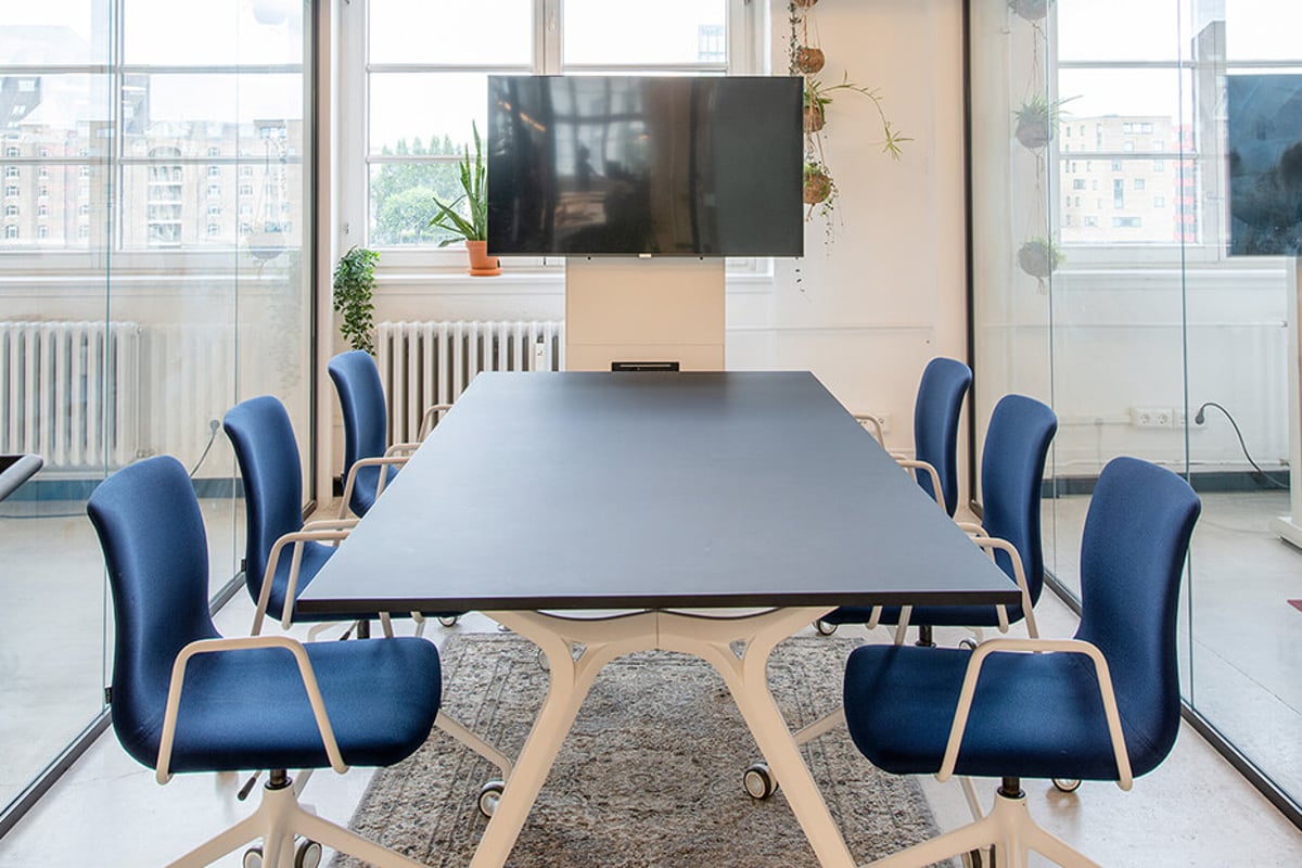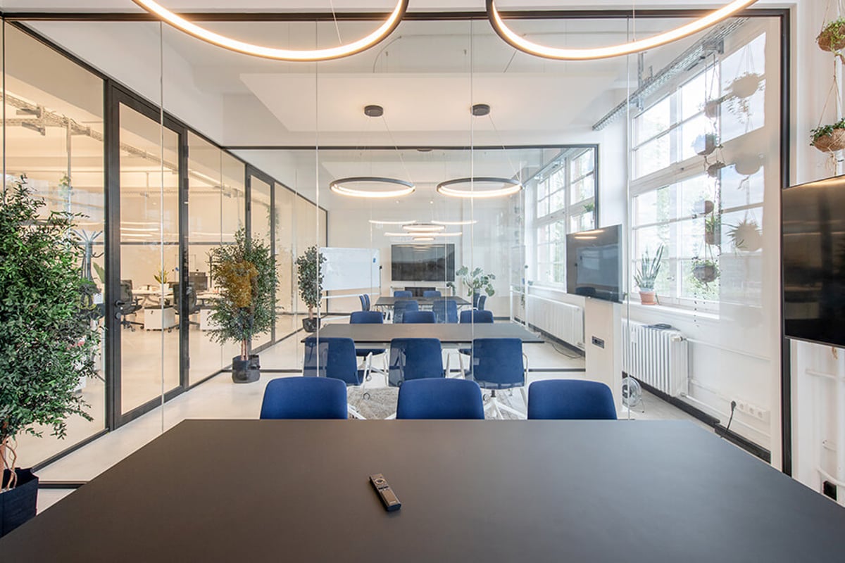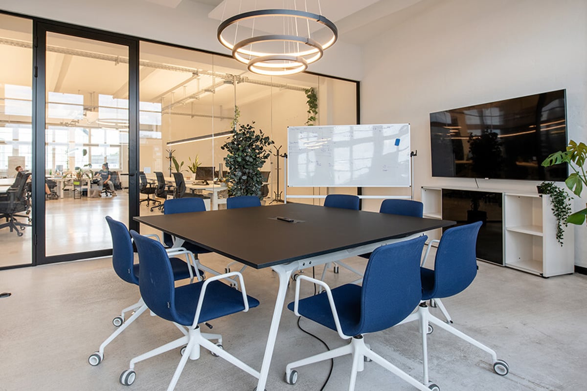 Glazed enclosures allow the meeting rooms to retain their independence without losing the connection with the rest of the spaces. Inside, the Arkitek table, with high technical features and a very artistic aesthetic, is combined with Noom 50 chairs upholstered in blue, with armrests and a four-spoke base with castors for greater mobility.