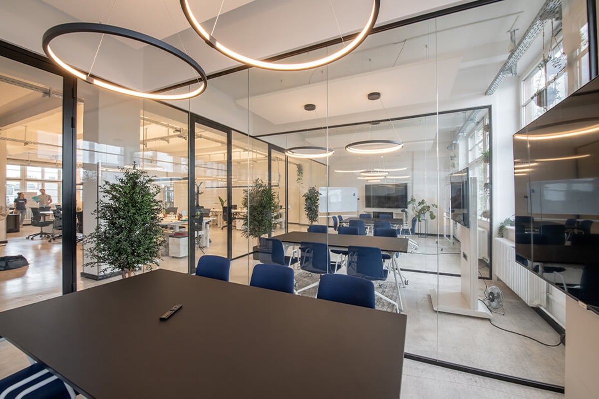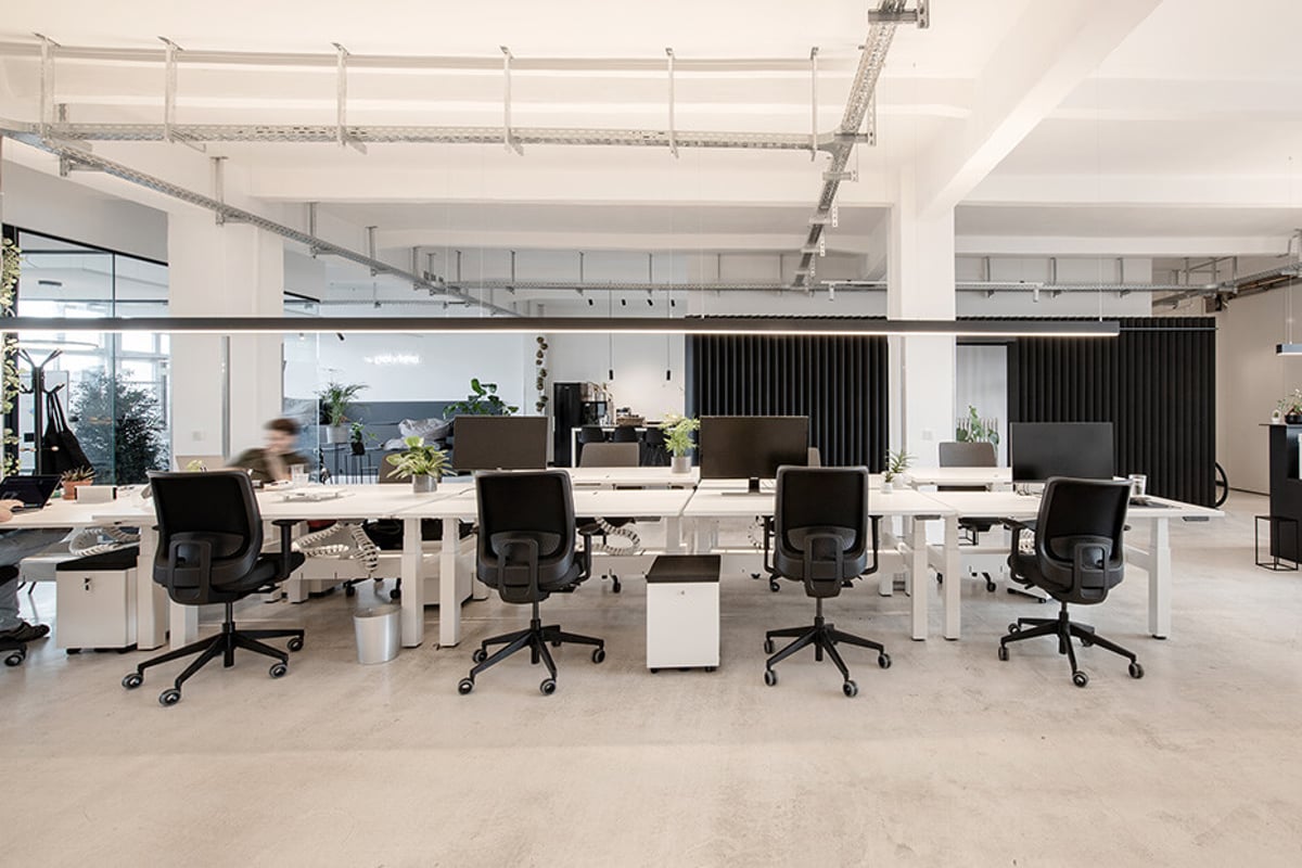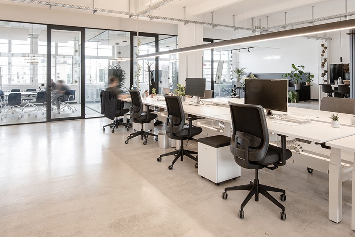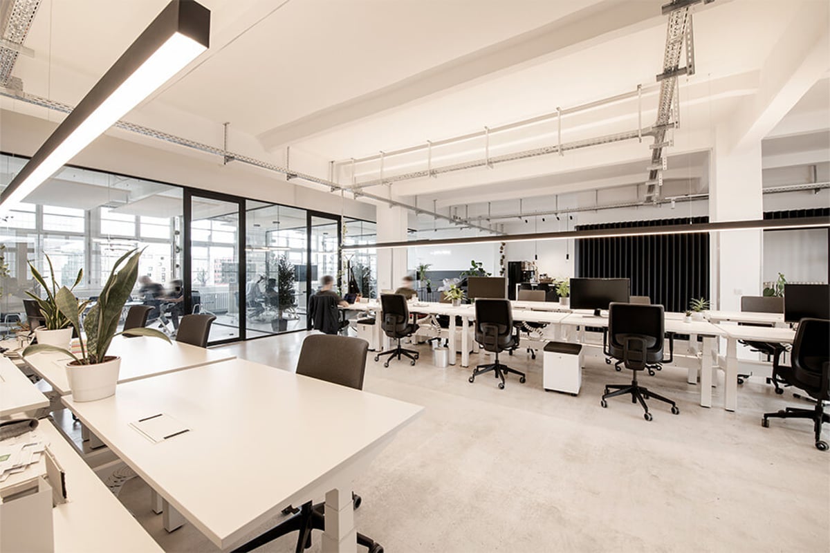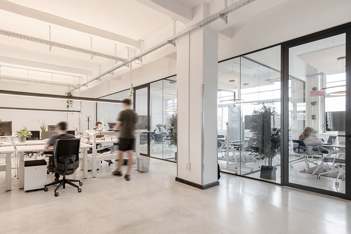 Located in the Kreutzberg district, the new offices respond to the work philosophy of a very agile, dynamic and flexible company in terms of hierarchies and timetables. An open-plan space with an open kitchen and communal area, fixed and flexible workstations, and three separate meeting rooms with glass partitions.