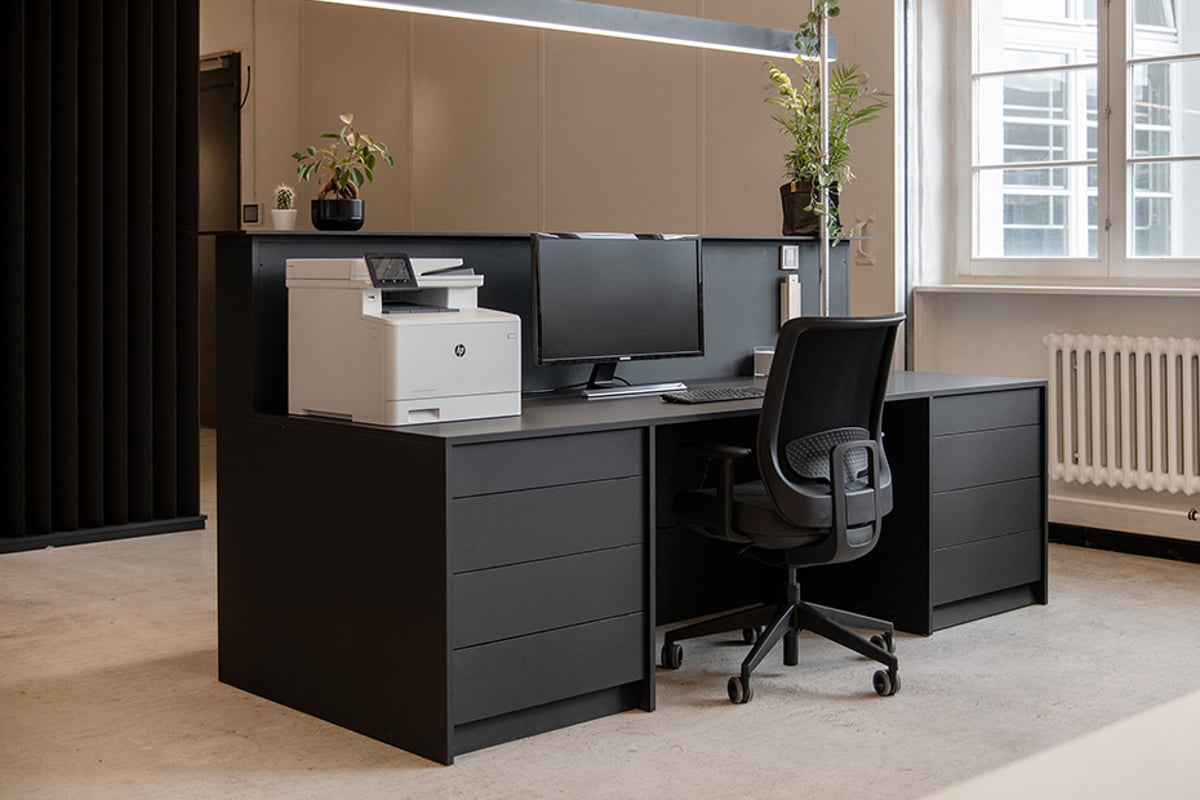 In line with the agile and dynamic character of the team, Mobility lift-top tables have been chosen for the operational area, a programme that prevents sedentary lifestyles and encourages a healthier lifestyle. The accompanying Trim chairs, which are also used for the reception desk, improve ergonomics with a back-friendly design. Bucks drawer units under the desks provide storage space and keep the office tidy.