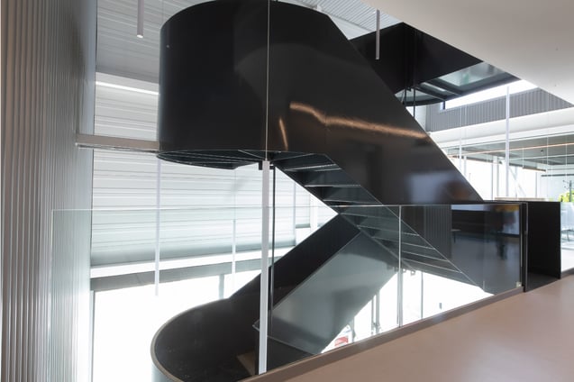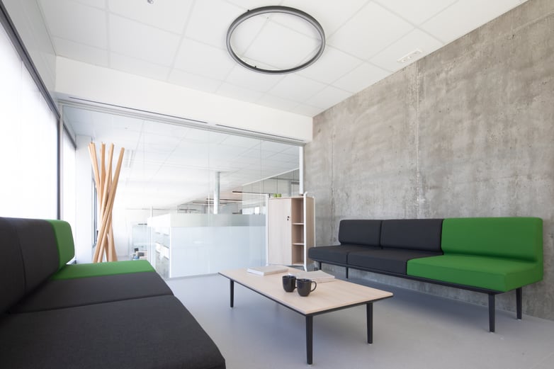 Once on the first floor and with another concrete wall in sight, a second waiting area offers seating in a space designed for communication and well-being. Longo armchairs with the company's corporate green, a table from the same range and an On Time storage system with wheels build a warm and welcoming atmosphere, which offers views over the work area.