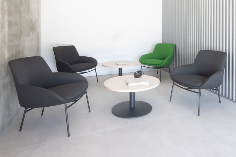 Next to the counter and with the brand's corporate green, a waiting room welcomes clients and visitors in a space furnished with comfortable Noom armchairs and low Tábula tables. Both convey a feeling of well-being and humanise a space lined with austere materials, with exposed concrete walls and corrugated sheet metal as a reference to the company's industrial character.
