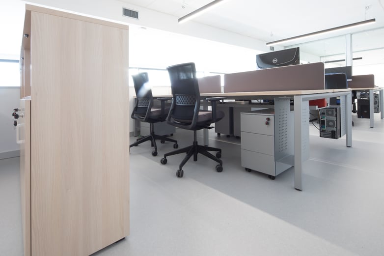 To generate unity and promote collaboration and teamwork, the workstations occupy two open-plan areas separated by the patio, with Vital Plus tables equipped with screens to offer privacy and create an individual workspace, along with ergonomic Stay chairs. In addition to the pedestals with wheels under the tables for personal use by workers, there are other low modular storage units that also offer storage.