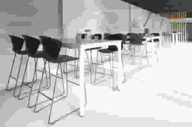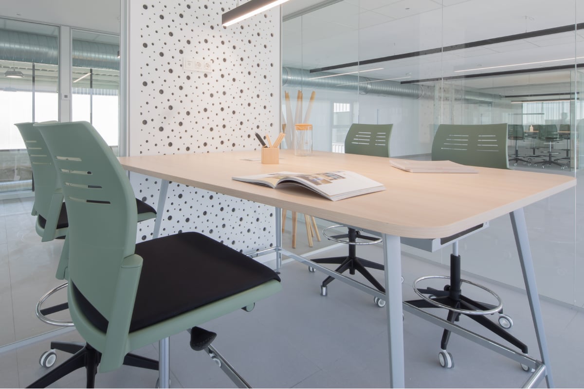 Small glass boxes interspersed between the workstations allow for informal meetings or teamwork to take place, without sacrificing any of the natural light and visual connection with the rest of the space. Some are furnished with Tábula meeting tables and Urban Plus meeting chairs, while others have the tall Twist tables and Spacio stools in green, which adapt to the different needs of workers, favouring changes in posture and fostering their health and well-being.
