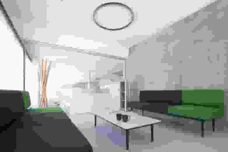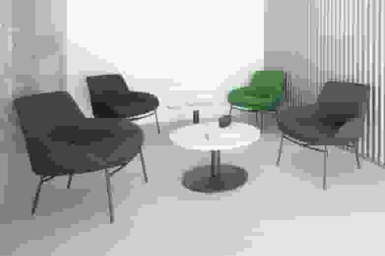 Next to the counter and with the brand's corporate green, a waiting room welcomes clients and visitors in a space furnished with comfortable Noom armchairs and low Tábula tables. Both convey a feeling of well-being and humanise a space lined with austere materials, with exposed concrete walls and corrugated sheet metal as a reference to the company's industrial character.