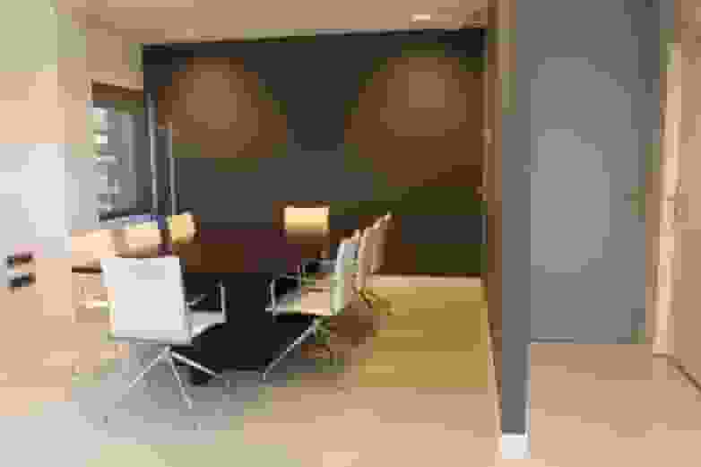 The meeting rooms have been designed in sober and elegant shades, a play on light. A big wooden wenge desk presides over the room. Around this , the attractive Ikara, upholstered in cream with armrests and chrome legs complete the configuration.