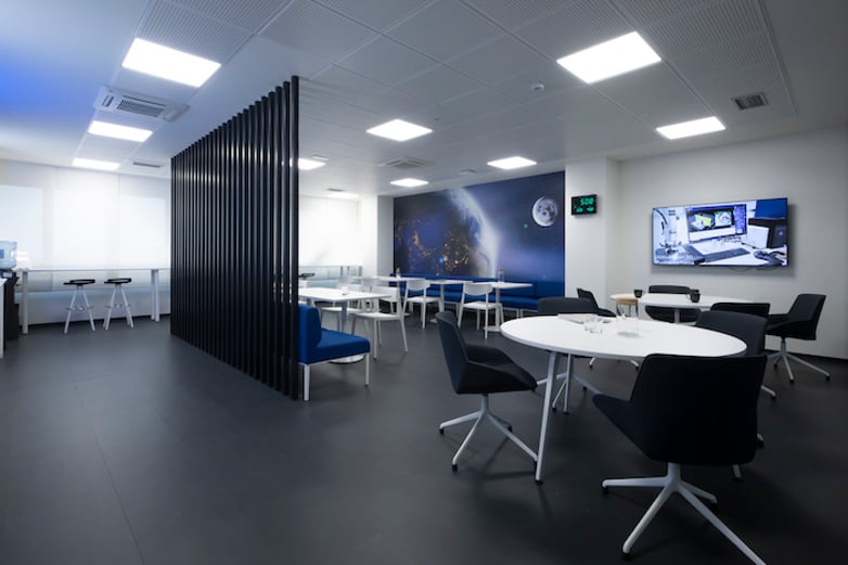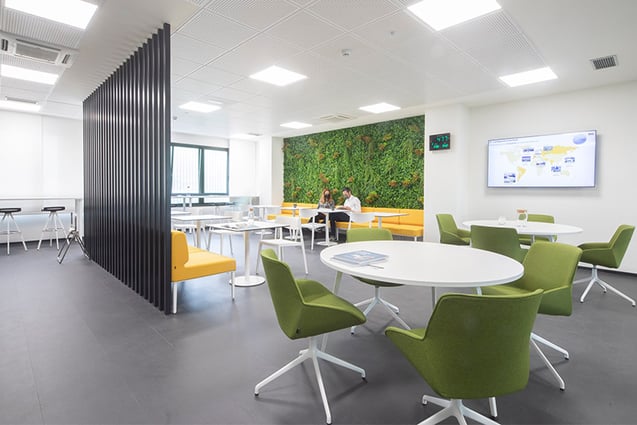 Three canteens with very different designs and colour schemes allow workers to have a drink, unwind, share and even work while seated. The first, with vibrant touches of yellow and green that incorporate nods to the natural environment and enhance the well-being and creativity of its occupants, another with a more 'futuristic' aesthetic, with carefully studied lighting and a chromatic range in shades of blue, and a third with touches of yellow and a playful comic-style mural.