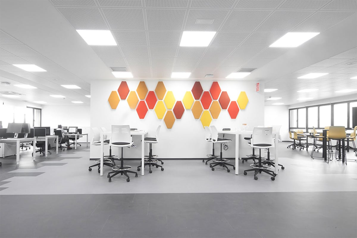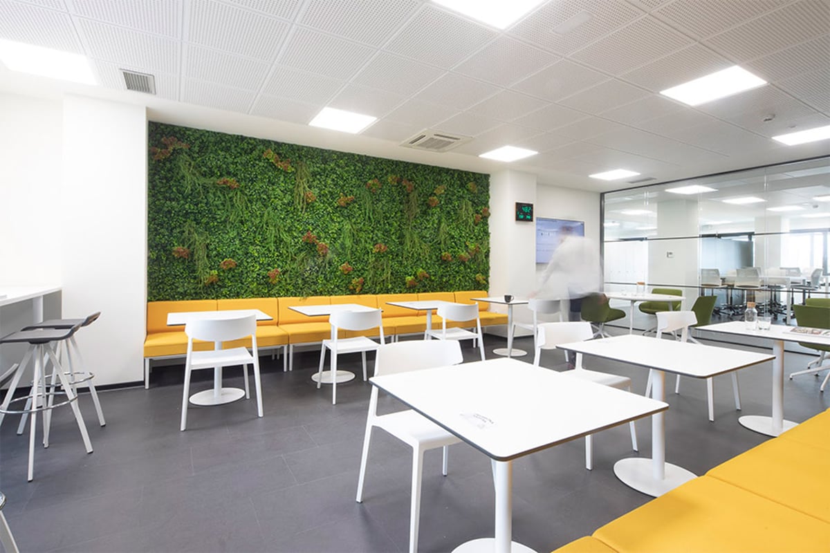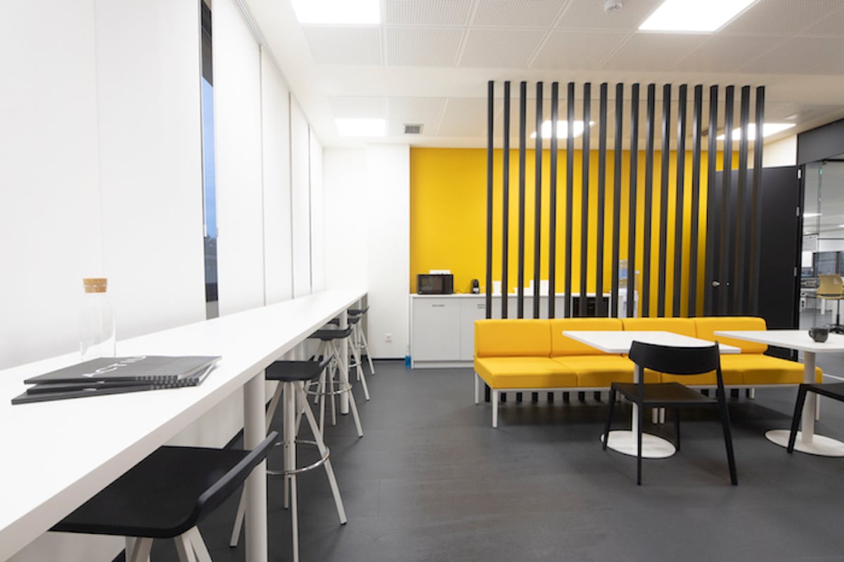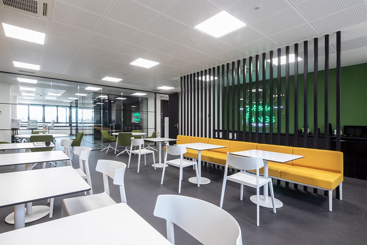 Three canteens with very different designs and colour schemes allow workers to have a drink, unwind, share and even work while seated. The first, with vibrant touches of yellow and green that incorporate nods to the natural environment and enhance the well-being and creativity of its occupants, another with a more 'futuristic' aesthetic, with carefully studied lighting and a chromatic range in shades of blue, and a third with touches of yellow and a playful comic-style mural.
