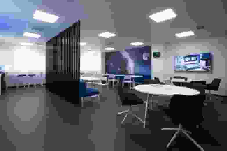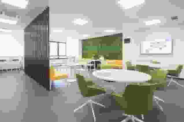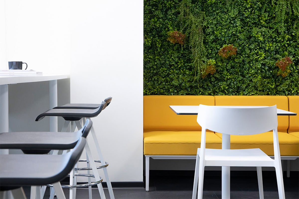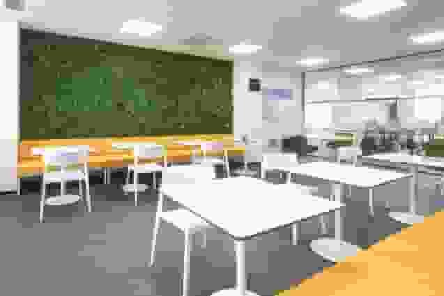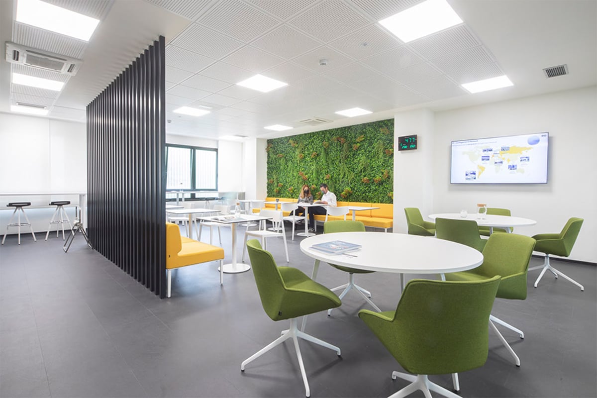 Three canteens with very different designs and colour schemes allow workers to have a drink, unwind, share and even work while seated. The first, with vibrant touches of yellow and green that incorporate nods to the natural environment and enhance the well-being and creativity of its occupants, another with a more 'futuristic' aesthetic, with carefully studied lighting and a chromatic range in shades of blue, and a third with touches of yellow and a playful comic-style mural.