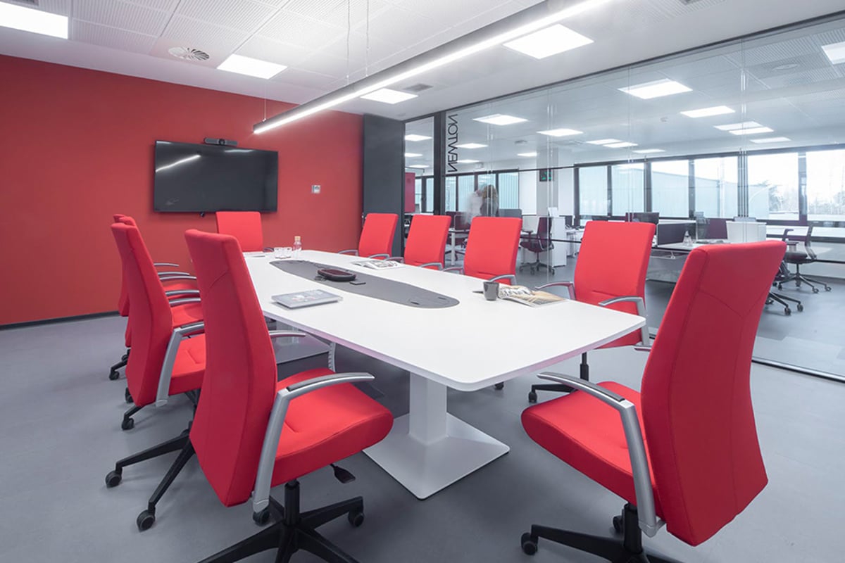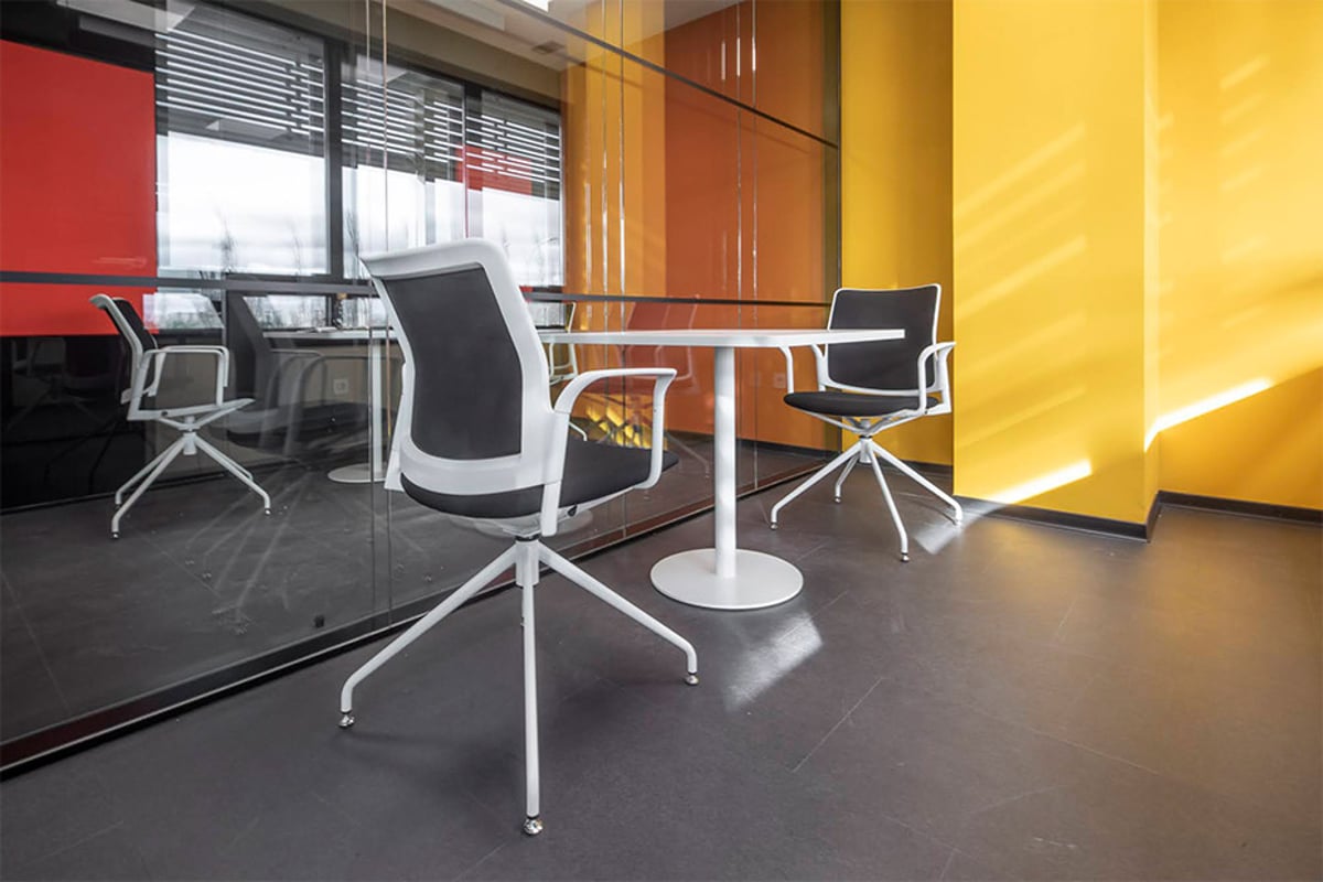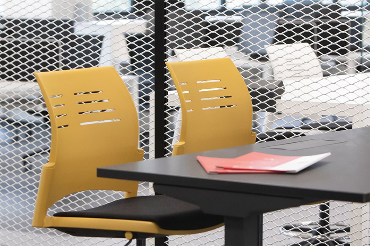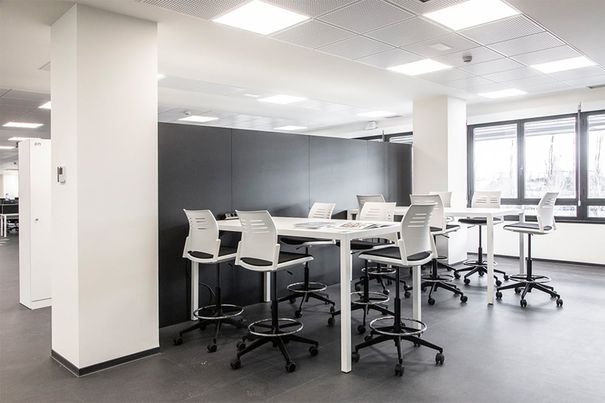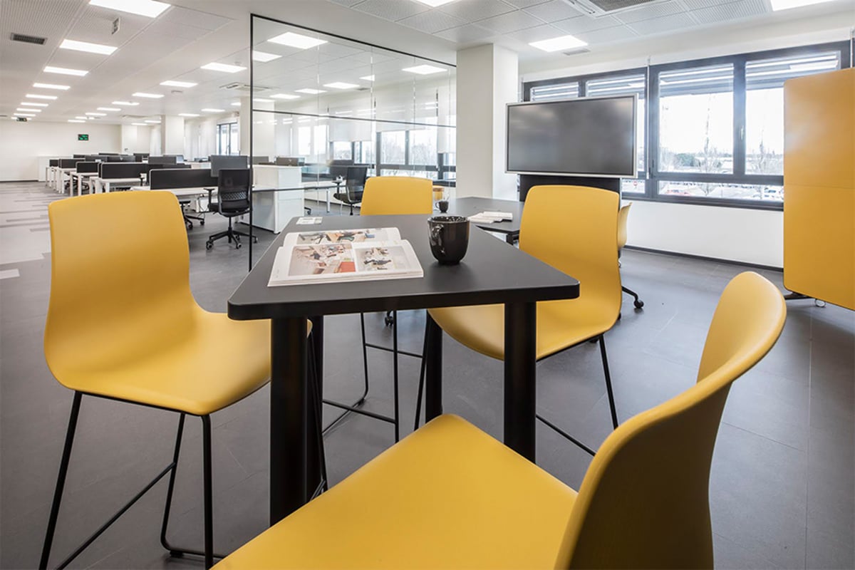 Visible behind glass planes that allow visual fluidity and at the same time provide privacy, the meeting rooms are equipped with Vital PRO meeting tables and Urban Plus 50 chairs with gas elevation for greater comfort and adaptation to the needs of each worker. These same chairs, with a non-return system and accompanied by Tabula tables, create small nooks and crannies for intimate and informal meetings.