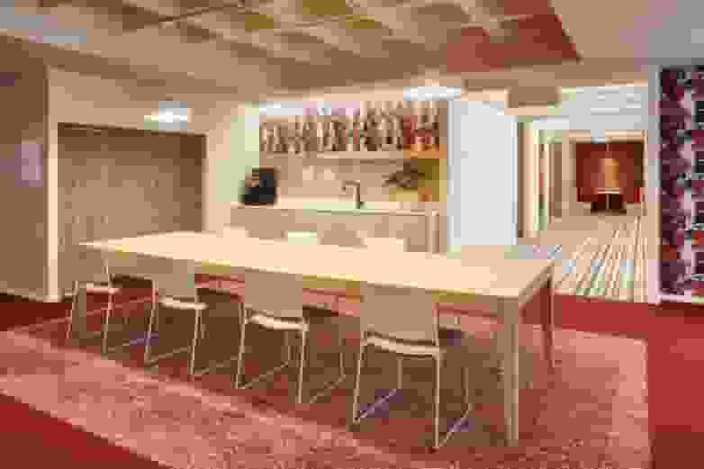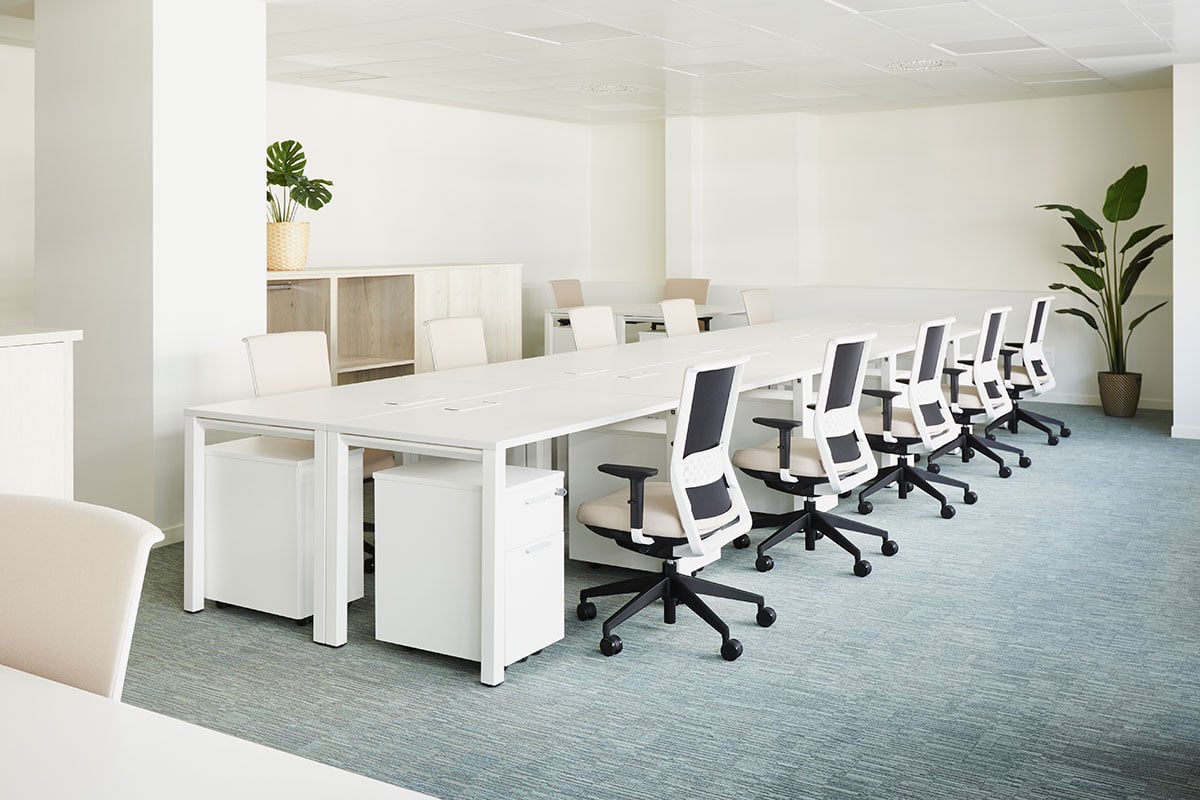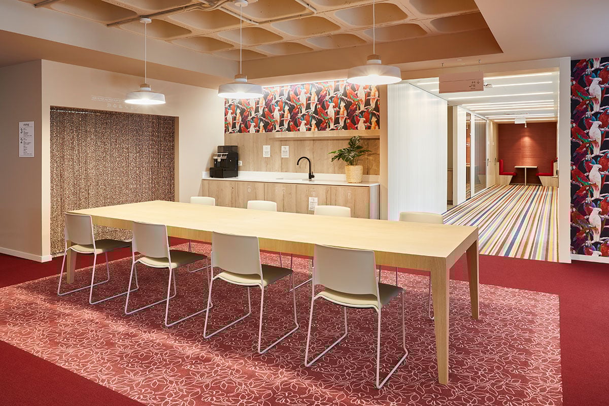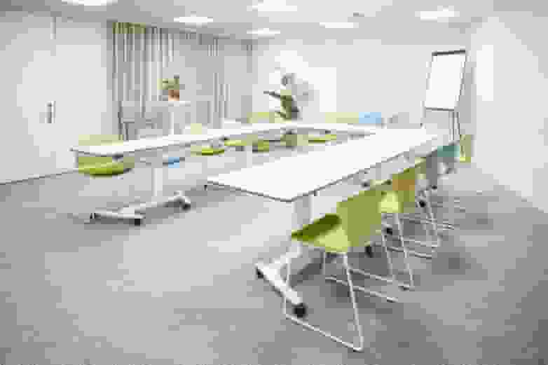To offer the possibility of using desks at different heights, one of the meeting rooms has been equipped with a 1-metre high Prisma table, accompanied by Noom stools. The rectangular Tabula table was also used in communal areas, and the round version with an electrification system in other meeting rooms.