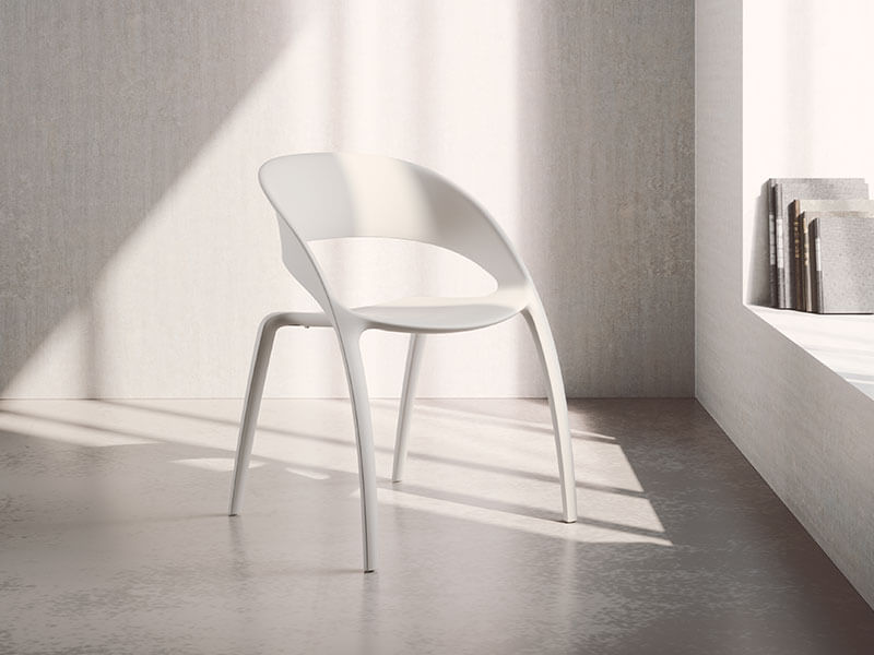 Its manufacturing process allows the weight of each piece to be significantly reduced which, in turn, makes it easier to transport and allows up to five chairs to be stacked.