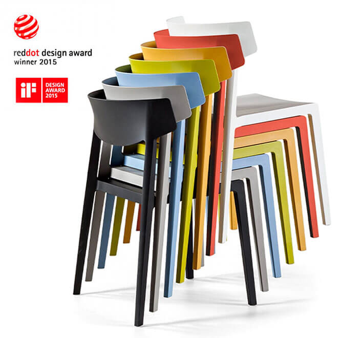 WING is made from polypropylene with glass fibre; this ensures the longevity of the chair and makes it one hundred percent recyclable. WING can stack up to fourteen chairs with a trolley and is available in seven different colours.