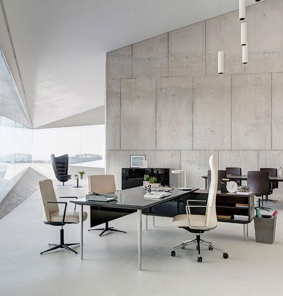 The LONGO desk's inverted pyramid-shaped legs play their part in creating that characteristic sensation of a raised tabletop and visual lightness in the room.