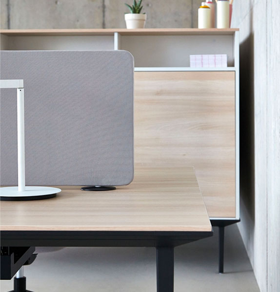 LONGO desks can be extended with all kinds of extras, such as sound-absorbing screens, cable access, skirts, bucks, etc. to provide the best possible office experience.