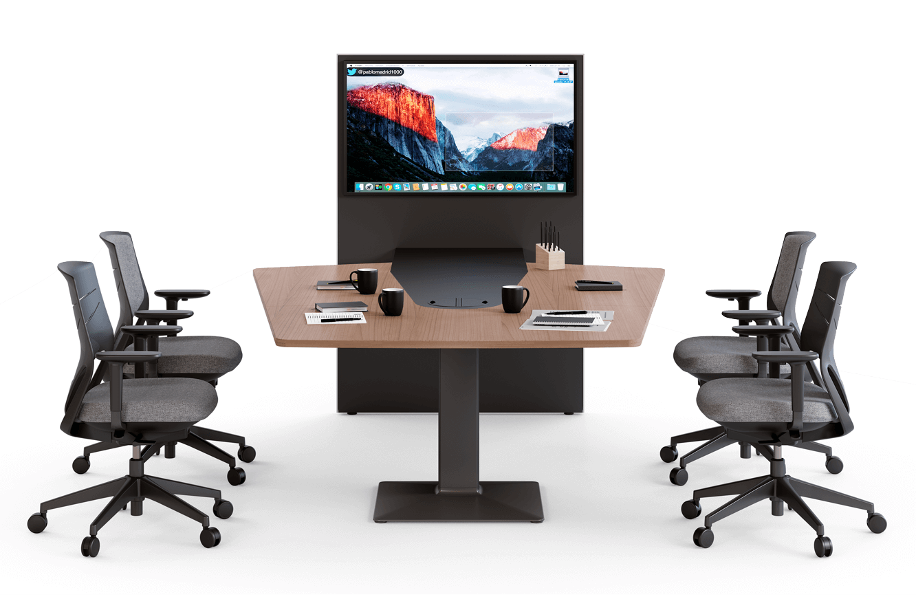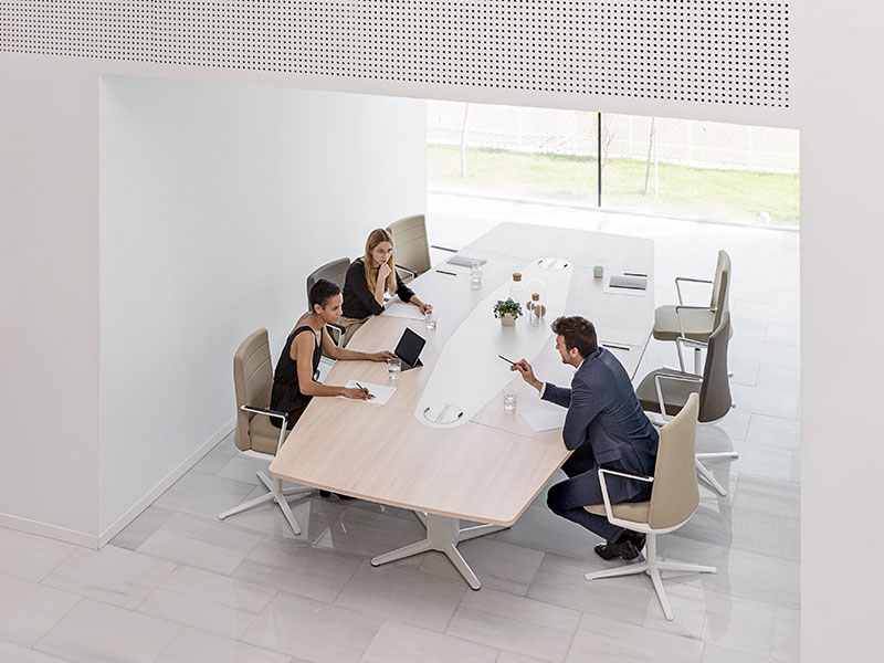 Power has videoconferencing tables with cutting-edge technologies organically built into the furniture. With noble materials, large dimensions and trapezoid-shaped, their design means all users can connect; from those attending the meeting to those on the other side of the screen.