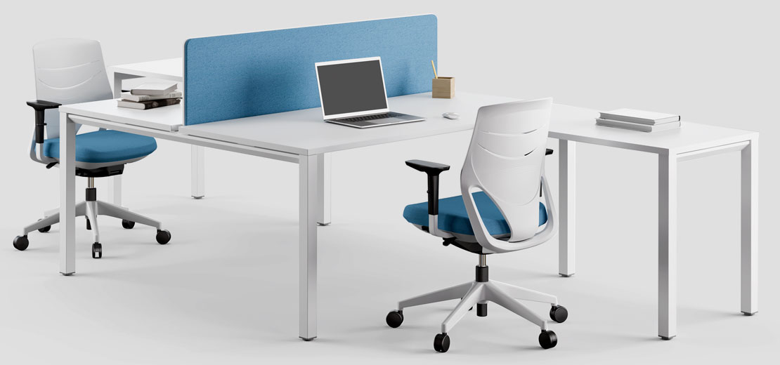 A wide program with a simple and elegant style with a big variety in finishes, two new cable management systems for individual and twin desks.