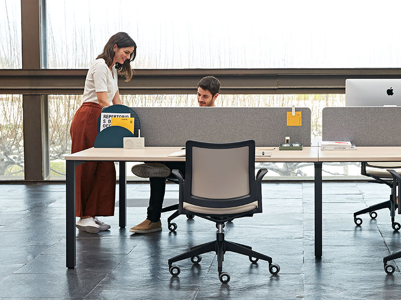 A wide program with a simple and elegant style with a big variety in finishes, two new cable management systems for individual and twin desks.