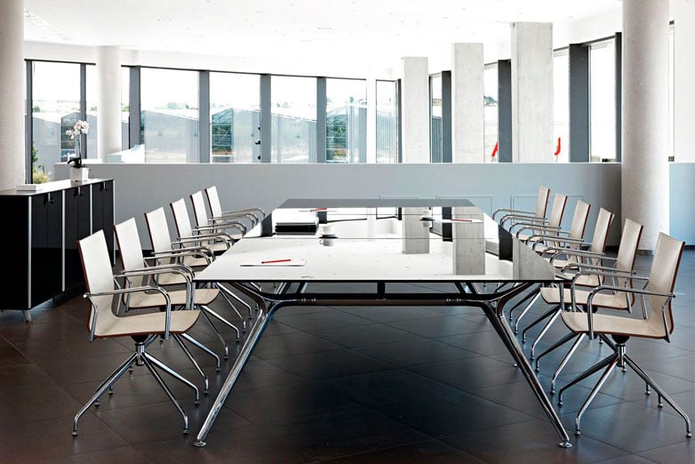 Esas opciones de customización se extienden también a las mesas de reuniones y mesas de dirección. Hasta hace pocos años esas mesas eran piezas de gran envergadura. Sin embargo, el diseño y la funcionalidad también se hacen hueco en este ámbito para generar productos diferentes, de un diseño especial y con personalidad. La mesa Arkitek se define por una estructura muy arquitectónica, creada mediante inyección de aluminio, que dota de personalidad a cualquier espacio.