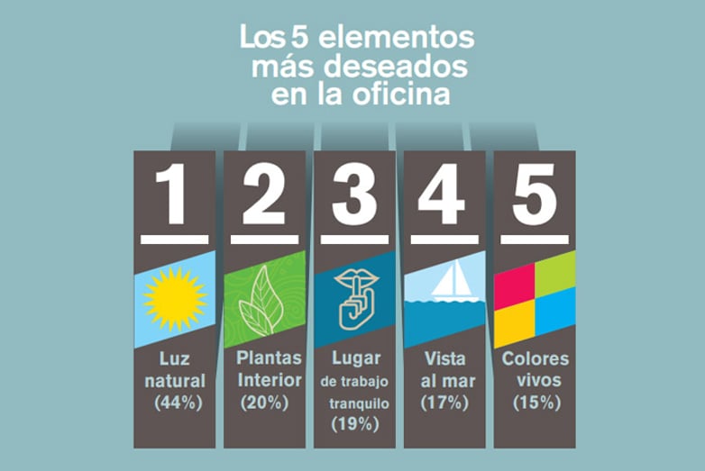 En este estudio se encontraron los 5 elementos de diseño más valorados por los empleados. Estos fueron los más votados: