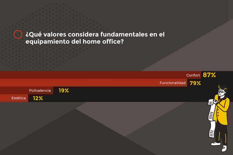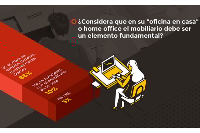 Pese a ello, la práctica totalidad de los encuestados, el 86%, considera que el mobiliario debe ser un elemento fundamental para el teletrabajo. Al valorar las principales prestaciones que debería tener la oficina en casa, los encuestados destacan el confort y la funcionalidad como principales, y la polivalencia y la estética como aspectos no tan relevantes.