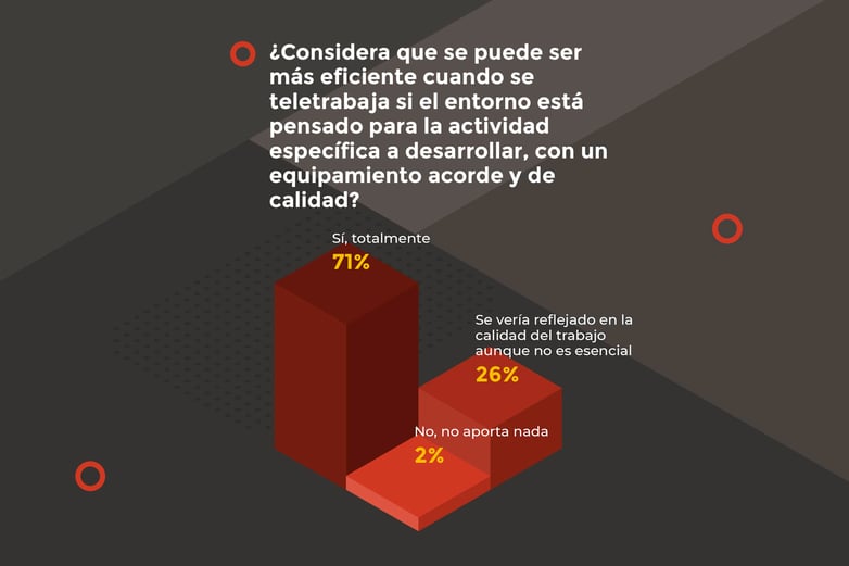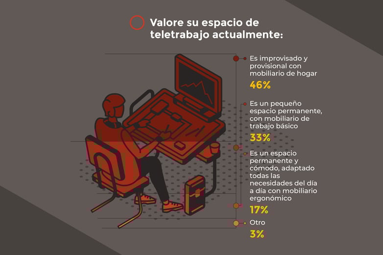En la encuesta, el 46% de las personas señala que su puesto de trabajo es improvisado y provisional, utilizando algunos de los muebles que ya tenían en su hogar, mientras que el 33% afirma que es un pequeño espacio de trabajo con mobiliario de trabajo básico, y el 17% que es un espacio permanente y cómodo, equipado de forma ergonómica.