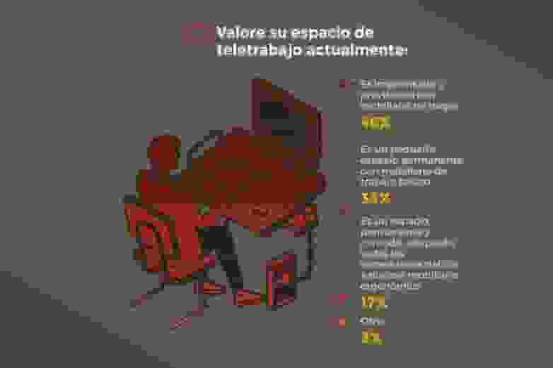 En la encuesta, el 46% de las personas señala que su puesto de trabajo es improvisado y provisional, utilizando algunos de los muebles que ya tenían en su hogar, mientras que el 33% afirma que es un pequeño espacio de trabajo con mobiliario de trabajo básico, y el 17% que es un espacio permanente y cómodo, equipado de forma ergonómica.
