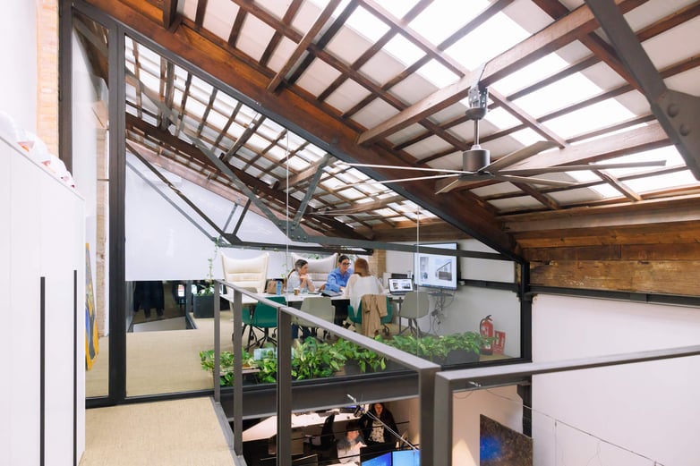 Un edificio que cuenta con un espacio abierto central, salas de reuniones, espacios y cabinas Qyos para mejorar la concentración, espacios de trabajo en equipo, área de servicios y patio trasero, para fomentar el bienestar y la productividad del equipo.