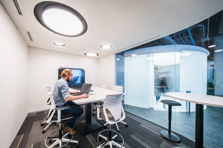 Concebidas en un momento en el que la mayor parte de proyectos corporativos optaban por un esquema mixto entre el open space y los despachos cerrados para los directivos, las oficinas Broissin Toreo apuestan por innovadoras soluciones que aseguran la habitabilidad del espacio. Para ello, se eliminan por completo los espacios tipo hot desk, que se sustituyen por células controladas de trabajo, ventiladas y reguladas con medidores de calidad del aire, con zonas autónomas de no más de 8 personas que aseguran que el contacto se reduzca al necesario entre equipos de trabajo.