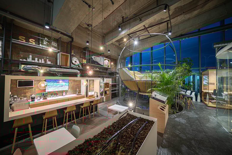 Para aumentar el bienestar del equipo, en las áreas de circulación y encuentro casual la iluminación se diseña como un reflejo del exterior, con una luz que va decreciendo conforme avanza el día y recrea el curso natural del ciclo circadiano. En el centro del espacio, una granja urbana y estanterías de hidroponía –una agricultura sin suelo, que utiliza disoluciones minerales para cultivar plantas– añaden un carácter sostenible, enérgico y vivo a una oficina colonizada por la naturaleza.
