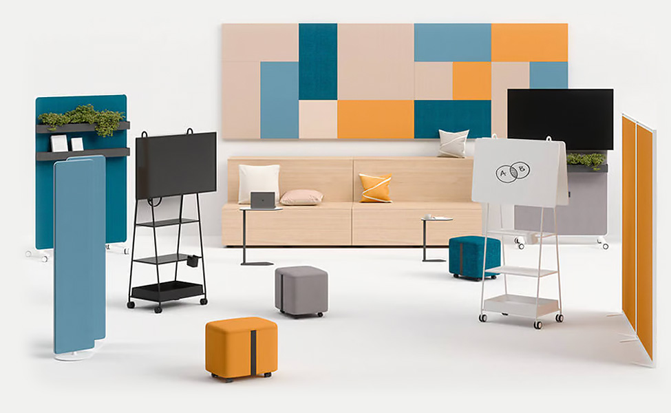 Un support mobile et léger qui permet de créer différentes ambiances, pouvant intégrer des tableaux et des écrans interactifs, ainsi que des accessoires complémentaires.