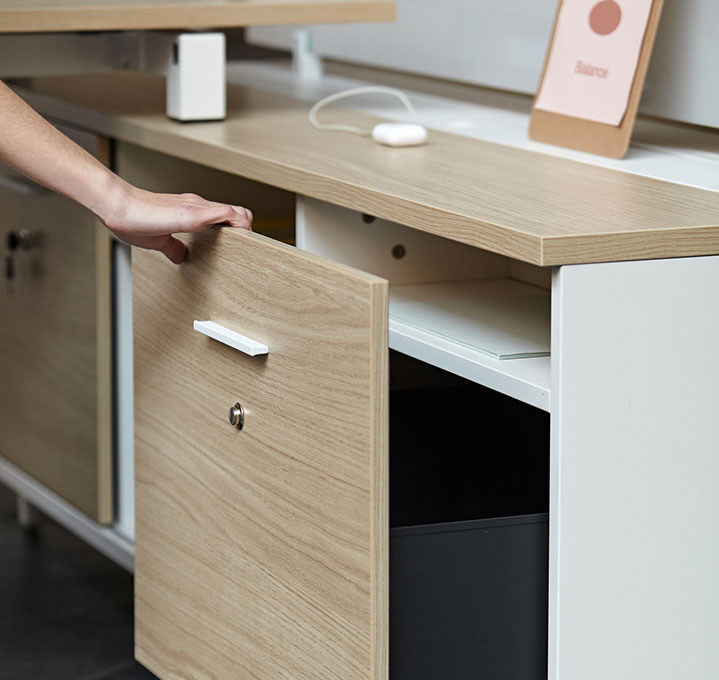 Lorsque le moment est venu pour le projet de prendre forme, la série Vital Plus Spine offre une grande capacité de stockage. Les tiroirs et les portes coulissantes permettent de tout avoir à portée de main : échantillons de matériaux, échantillons de couleurs, gadgets technologiques et articles de papeterie. Une option idéale pour maintenir l'ordre dans les moments les plus chargés de la journée de travail.