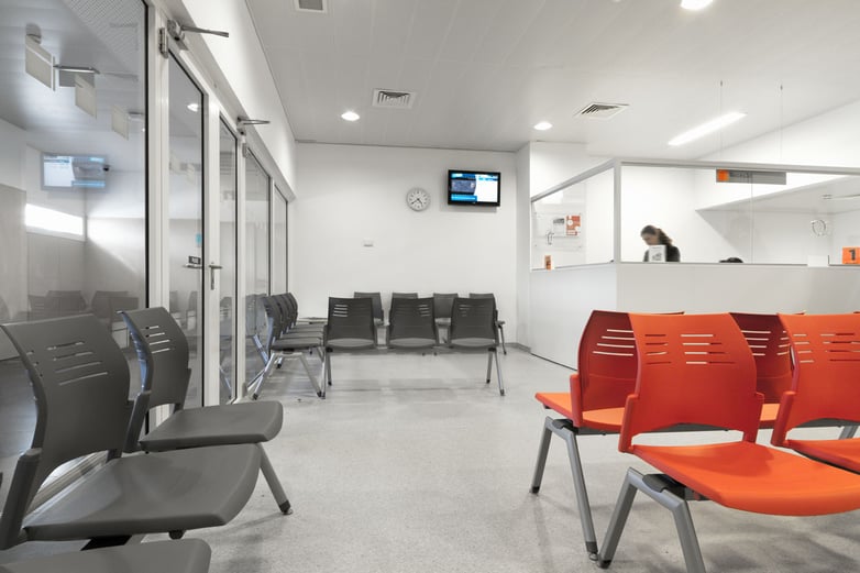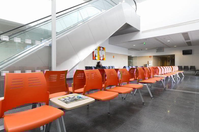 Les cinq étages qui composent l'enveloppe du bâtiment, sont interrompus par des cours et des ouvertures dans les façades, conçues délibérément pour capter la lumière naturelle constante. Ces emplacements permettent également de profiter du paysage et d'une meilleures ventilation naturelle. La poutre d'assise Spacio aménage les espaces d'attente. Fabriqué en polypropylène et en fibre de verre, elles offrent une ample gamme de coloris.