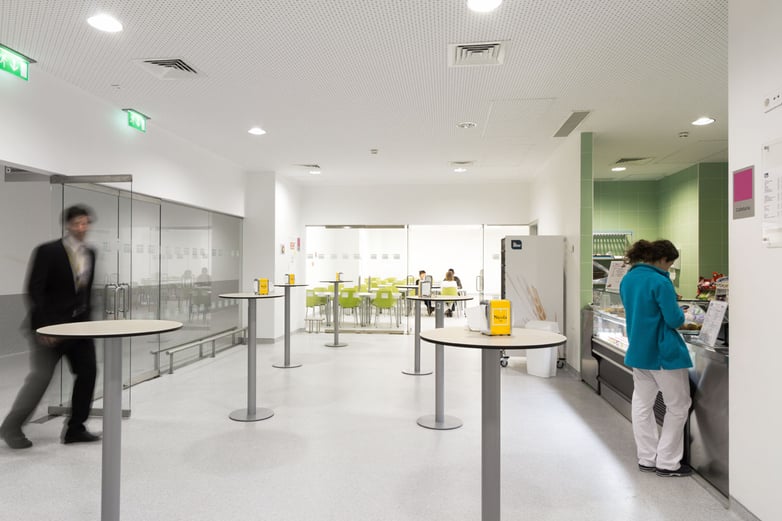 La cafétéria est aménagée du programme de Tables de Cafétéria, avec la nouvelle version en hauteur, de 110 centimètres, qui servent de point d'appuie pour une restauration debout et informelle.